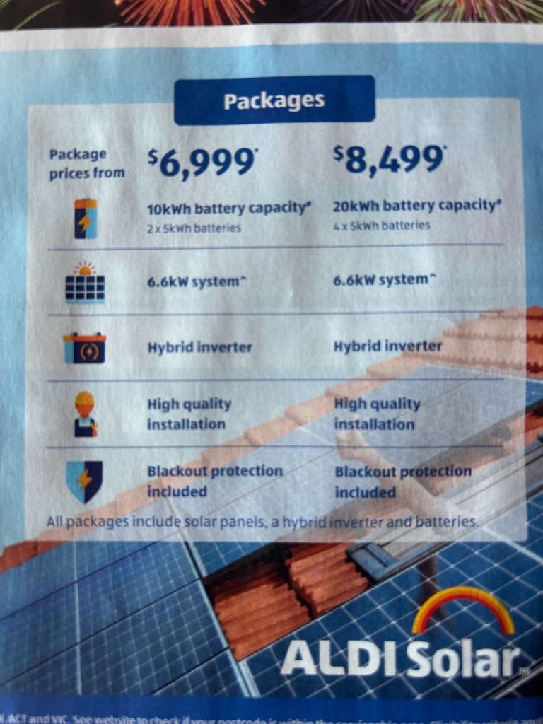 I recently saw in a supermarket advertising magazine/brochure, that you can now buy a 10 kW battery and 6.5 kW of Solar PV for $7,000. Or even better, 20kw battery with 6.5kw of PV for $8500.