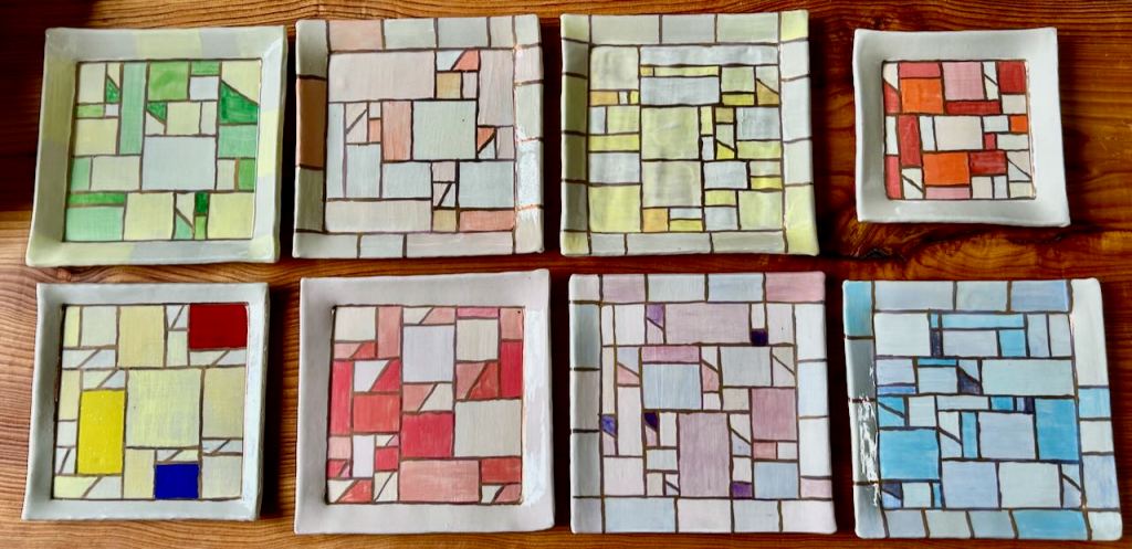 Using these colours, I tried making some new square plates, with a Korean inspired ‘Bojagi’ traditional fabric design. I’m very pleased with them, for a first attempt. I quite like the one were I ‘channel’ Piet Mondrian. Mondrianic bojagi!