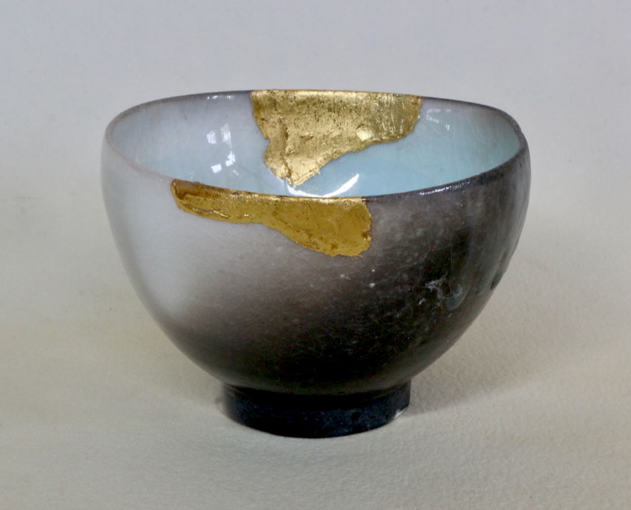 ‘Kintsugi’ gold leaf repair is a way of restoring a beautiful, but slightly damaged pot back to full radiance. I think that if a good pot is damaged in the fire that made it so lovely in the first instance, then it’s worth giving it a bit of love and TLC to make it even more beautiful. I lavish a lot of effort, skill and time into retrieving them from the scrap bench and repairing these sensitive and beautiful items, bringing them back to life. Some times gluing a broken or chipped piece back together, and at other times actually rebuilding a bit of the surface that is missing. In this way I bring them back to life and give them an honourable new existence. They are even more precious then, than they were if they had come from the kiln undamaged. I am recognising their potential beauty and honouring it. In this slow, patient application of time and effort they become more special to me.
