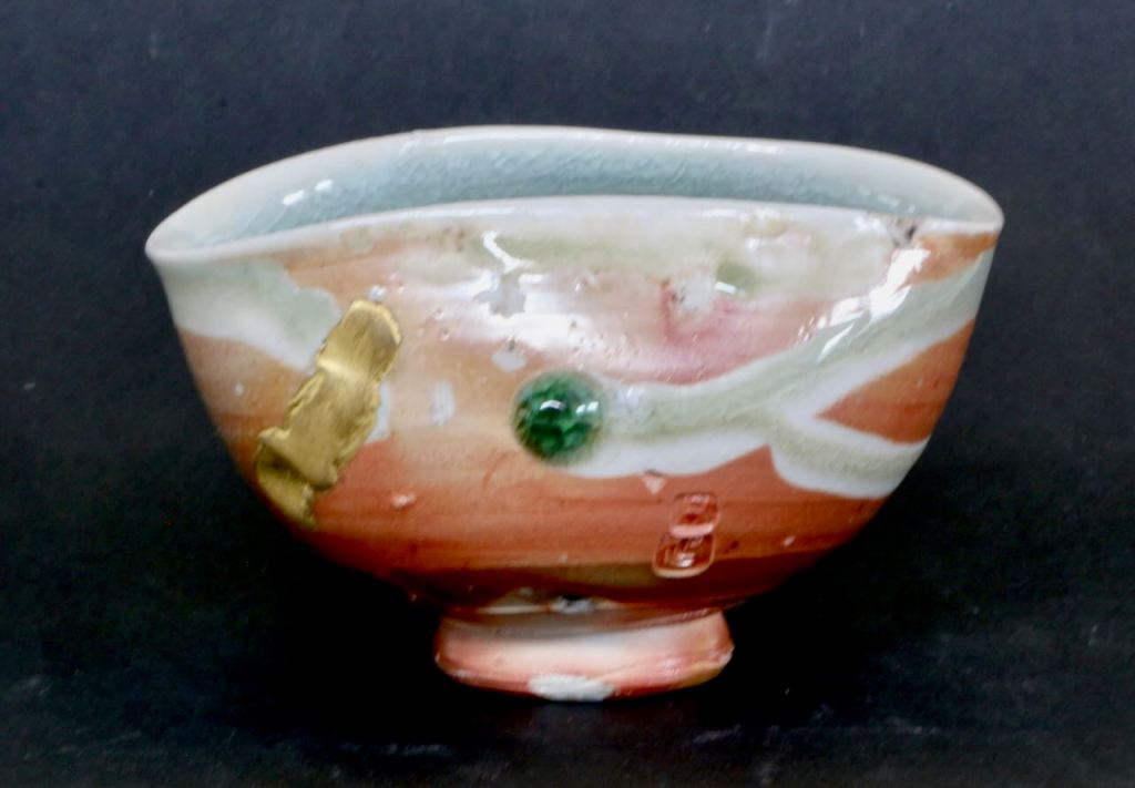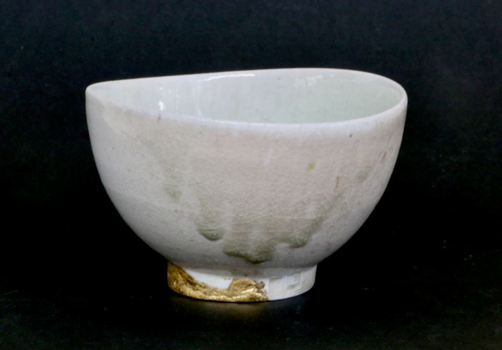 These porcelain bowls are absolutely white, but one of them have such a high degree of carbon fused into their surface during the reduction cycle, that it appears to be black. But when you look inside the bowl, it is glazed with a delicate blue celadon. I love this dramatic contrast of black and pale blue! The white bowl above has so much ash glaze built up on the fire face of the bowl that the ash began to run down and glue the bowl to the kiln shelf, running down over the wadding and making a fluid pool of ash glaze on the shelf. Tragically, I broke part of the foot off trying to extricate it from the glassy mess. I built up the missing part of the foot, back to its original form with the kintsugi technique and finishing it with 24 karat gold. All three of these bowls above, are very translucent.