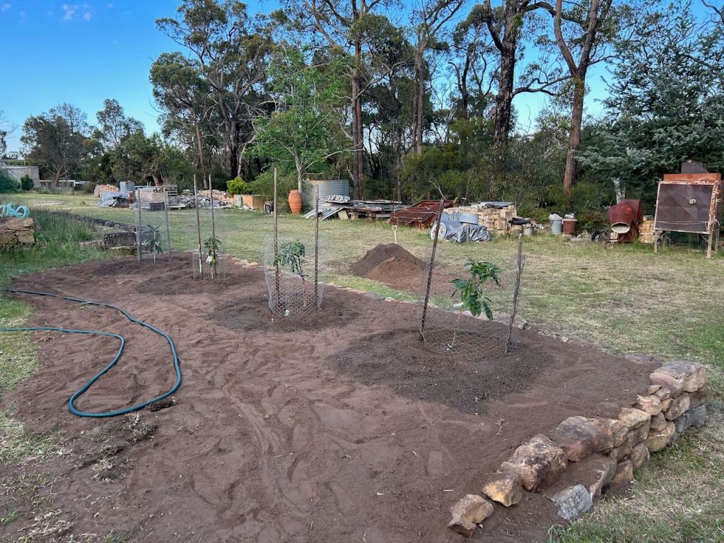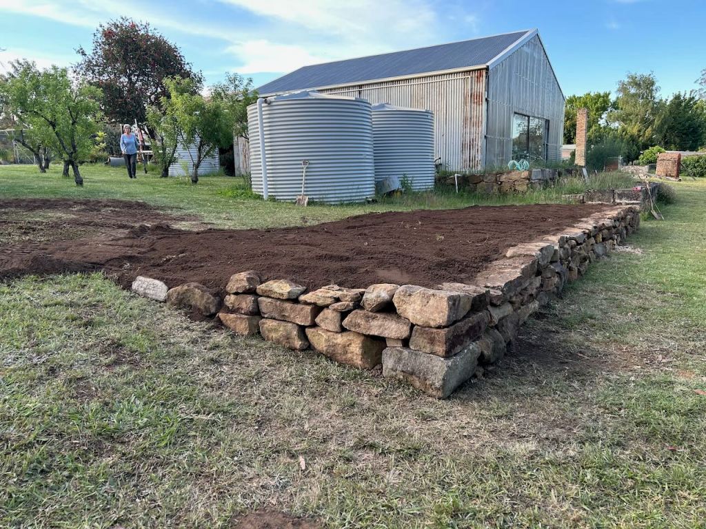 This explains the new elevated, well drained, garden bed and stone retaining wall. This new terraced area is 4m x 10m and 500 to 600 mm deep. Filled with a rich mixture of sandy top soil and organic compost mix. 10 tonnes in all. It was quite an effort and I’m feeling my age today. As Leonard Cohen once said. “I ache in the places that I use to play”.