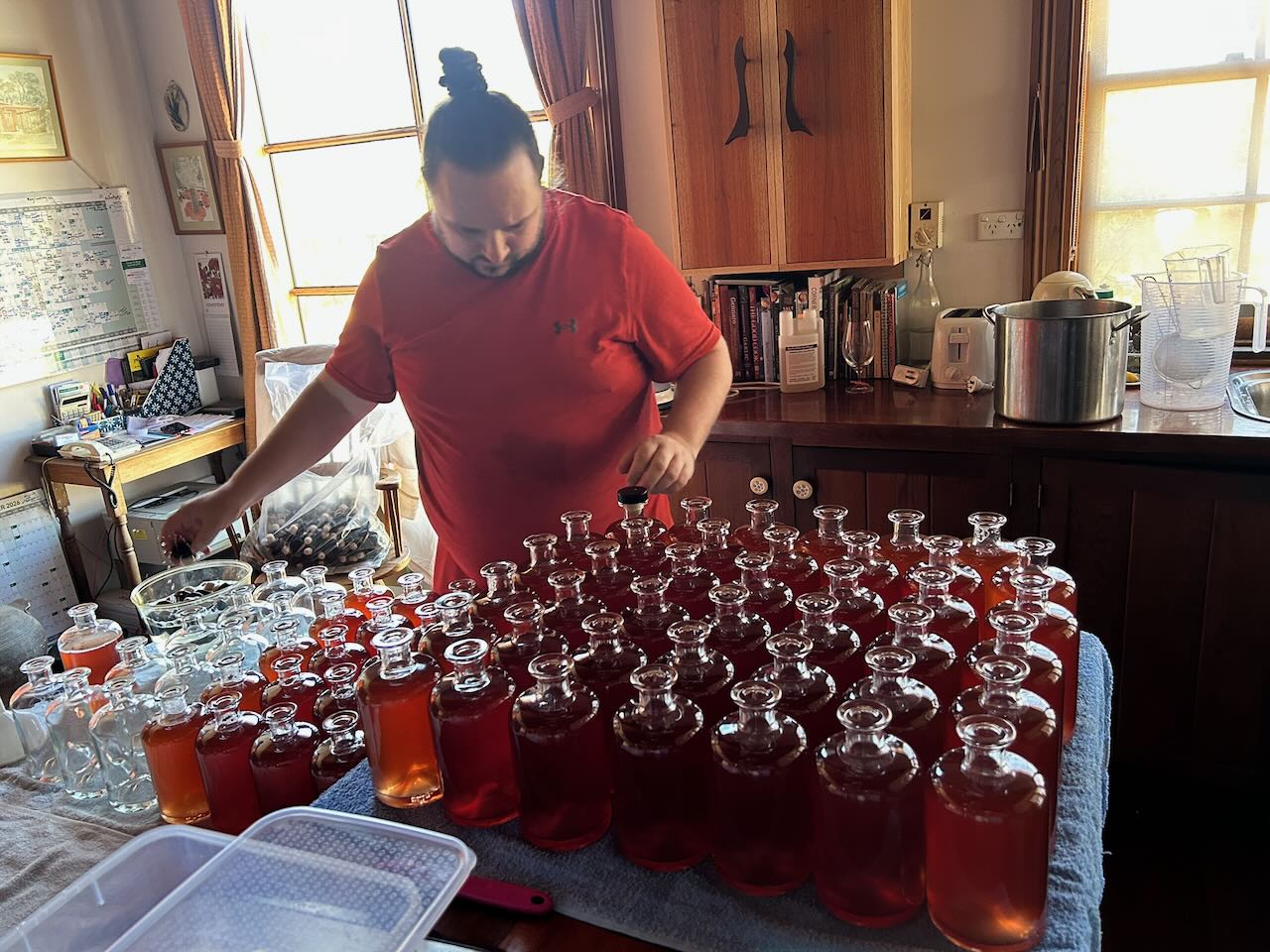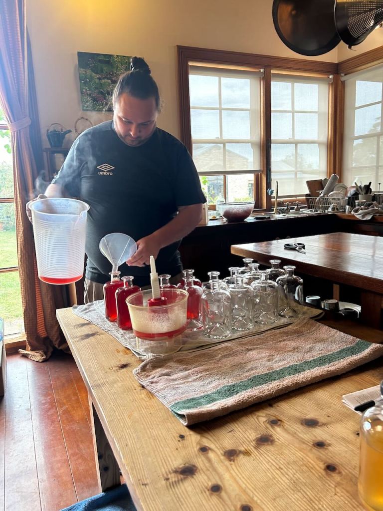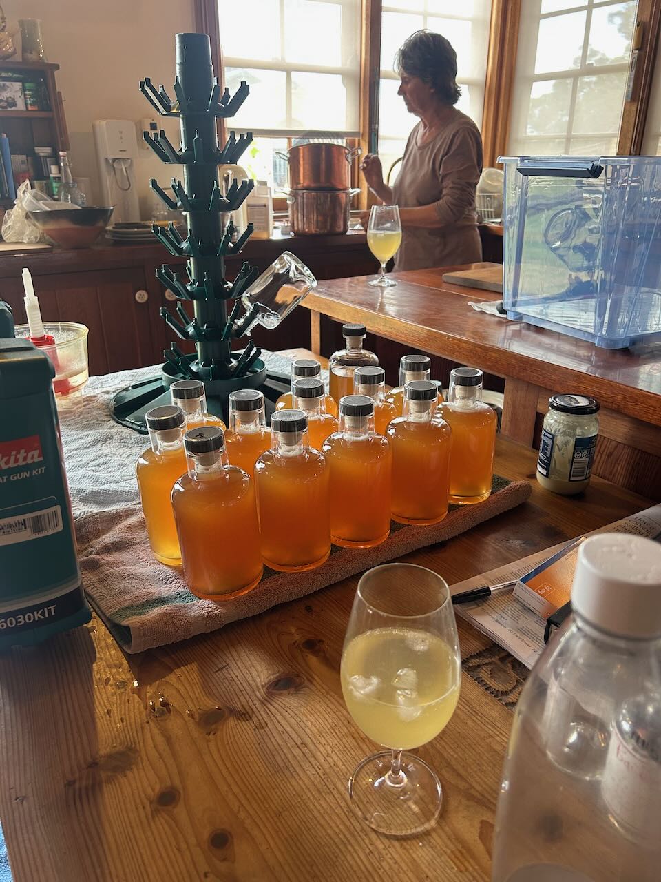 Our son Geordie has started a new business making small batch, seasonal cordials, while he waits for his liquor licence to come through. He has been a gin distiller for the past few years since the fire. He has now gone out on his own. Without the liquor licence, he can’t sell his gin as yet. But he can make and sell his special, small batch, local, seasonal cordials. A lot of the produce for this has come from our garden and orchards so far.