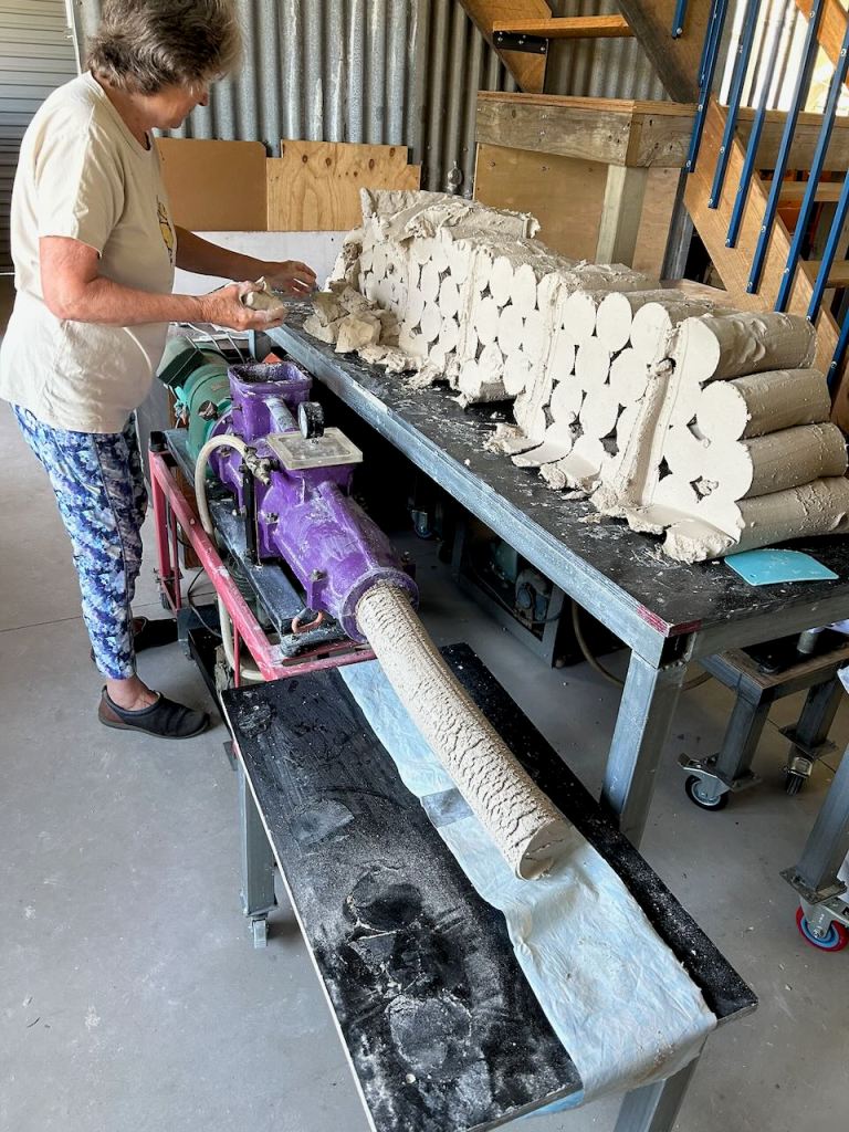 Janine and I have processed over a tonne of clay this year through our equipment. Each batch that we make is unique. As we do everything ourselves, we can make each batch of clay slightly different in order to closely match the type of projects that we are planning to make. This latest batch is slightly coarser in texture to facilitate making larger forms. The added grit helps the clay to stand up better in larger forms. We also make fine stoneware as well as porcelain.