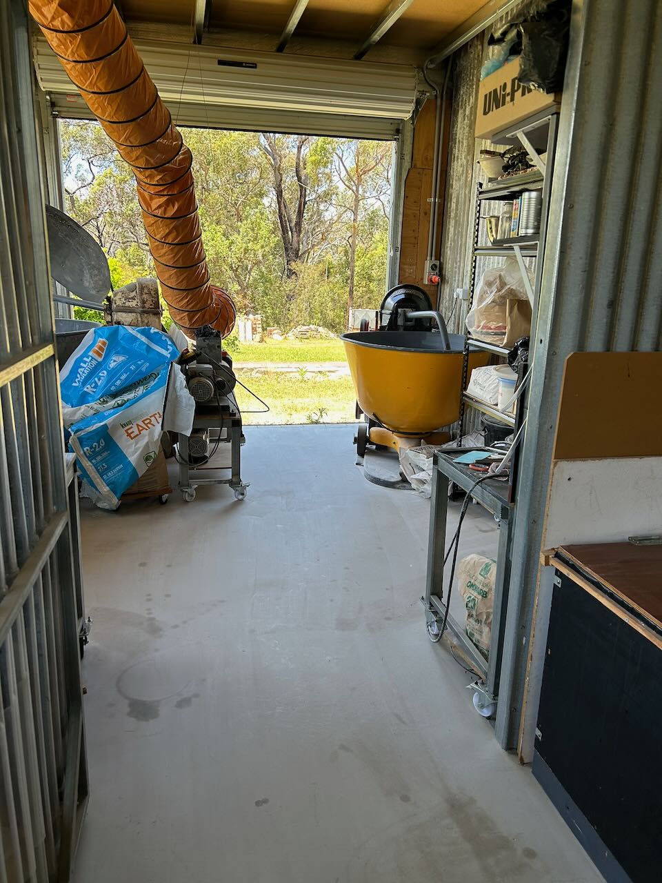 I like to keep the workshop as dust free as is possible. After a change of water and a 2nd mopping, the big roller doors at each end of the workshop are opened up and the breeze flows through and drys the floor.