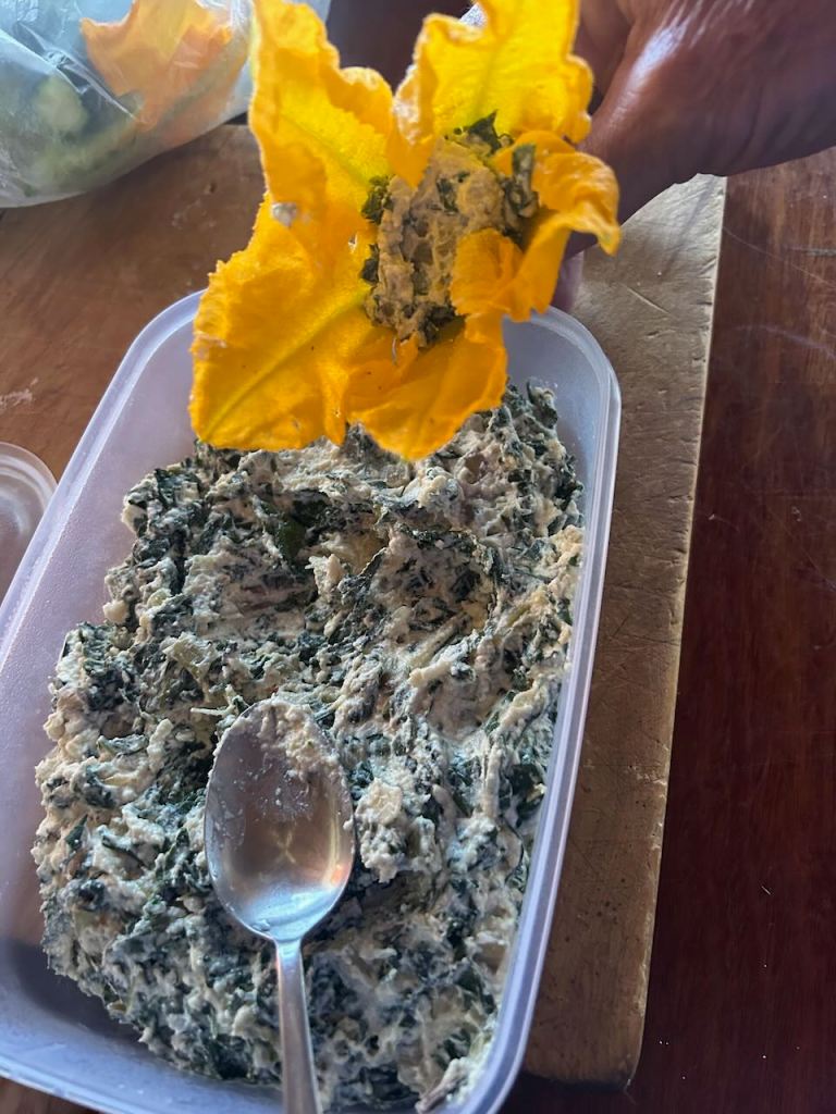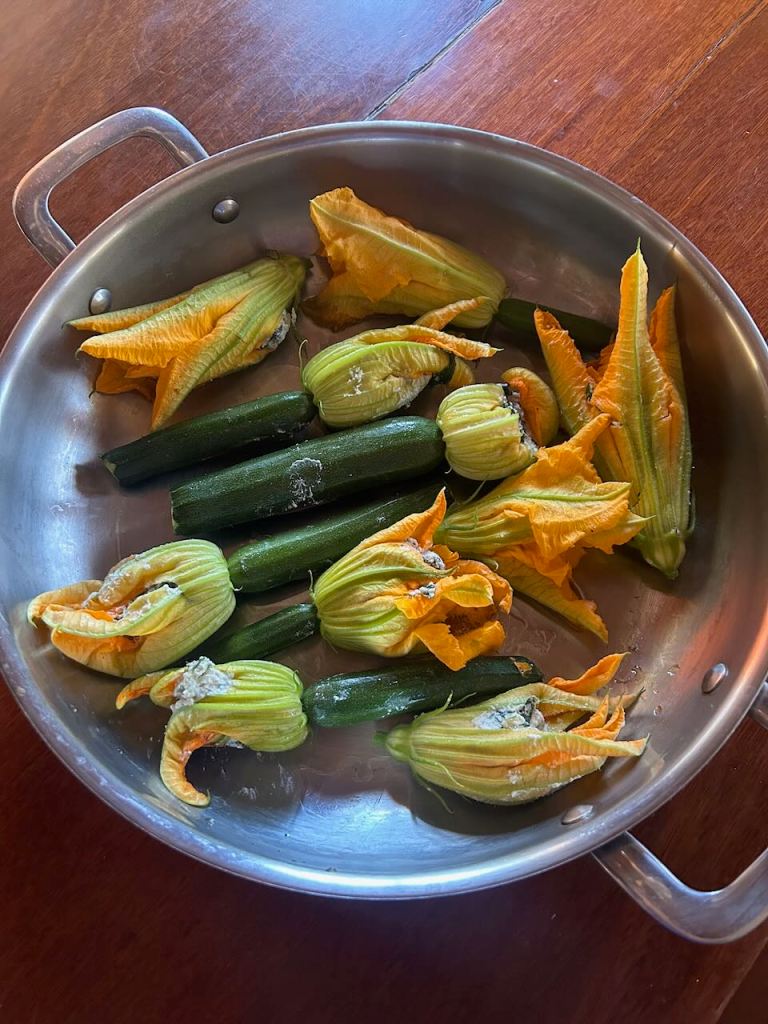 The zucchinis are going mad, so we are having a few meals of stuffed zucchini flowers. It’s a lovely summer time light meal. It achieves 2 important outcomes, by picking the flowers off the plant with the nascent fruit attached behind, it makes a colourful and delicious meal, but it also takes the fruit off so early that they don’t get a chance to explode into marrows if you just glance away for a moment or loose concentration, zucchinis fill out so very fast! Managing zucchinis means defusing them every morning early before they expand like The Big Bang!