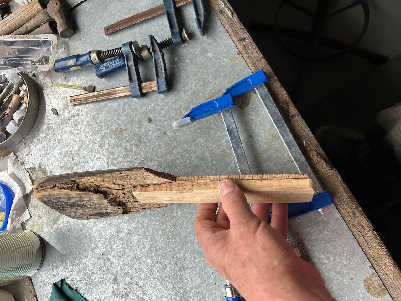 I hate to see waste, so I made one of the rotted staves into a textured pottery tool. A paddle for creating texture while changing the shape of a larger pot. I’m teaching a weekend workshop of tool making next weekend, so this can be one of the projects. i have lots of these old textured staves now. I had to shape and add and new wooden baton, to reinforced and strengthen the handle. A rewarding project that avoids waste and recycles some old timber into something useful and precious. I love the natural, organic texture of the old weathered wood.