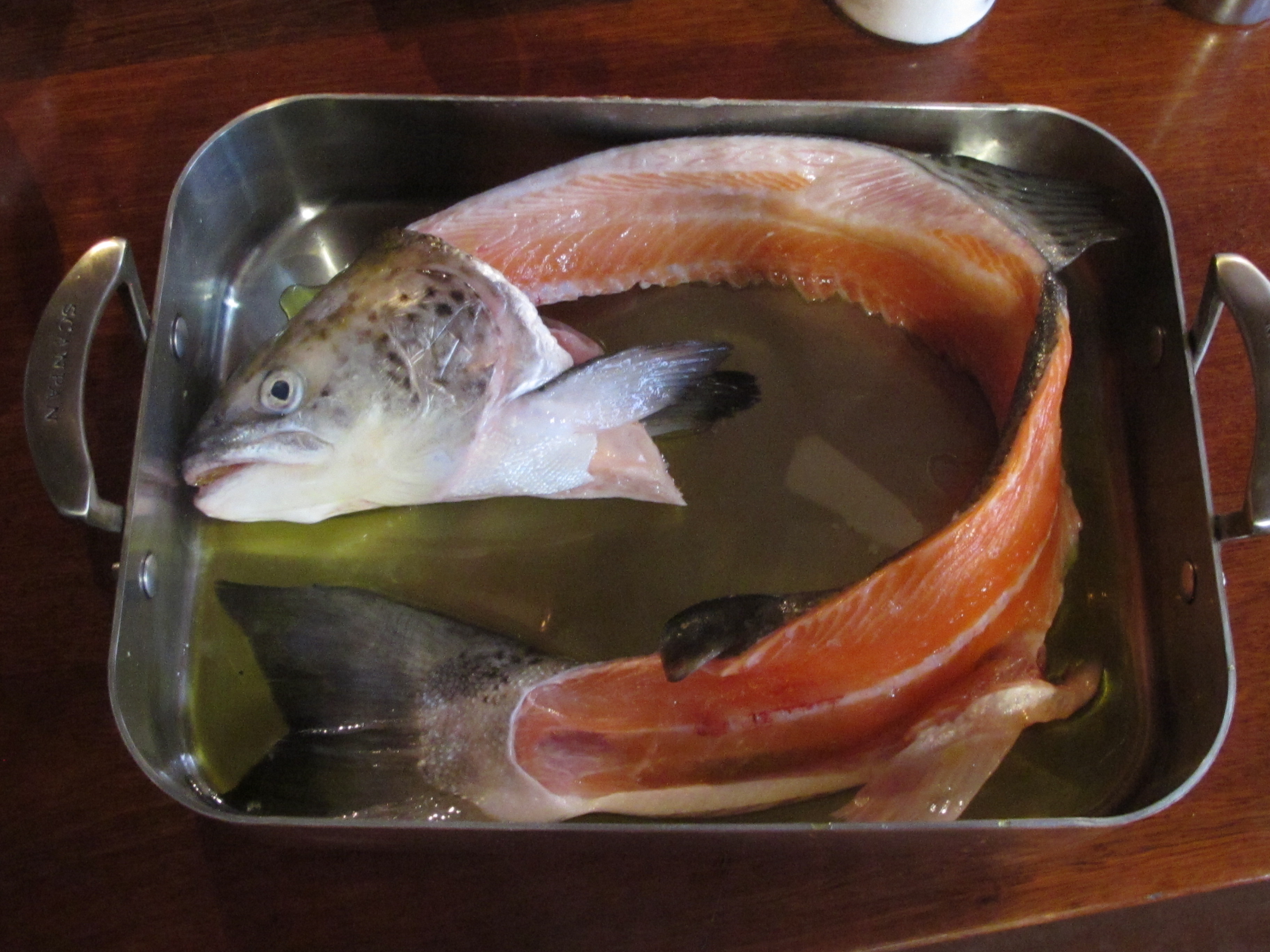I am at the fish market and see that filleted salmon frames are only $4. They appear to have a lot of meat still on them, so I decide to give it a try. It’s a big fish, or at least it was. It’s still a long frame.