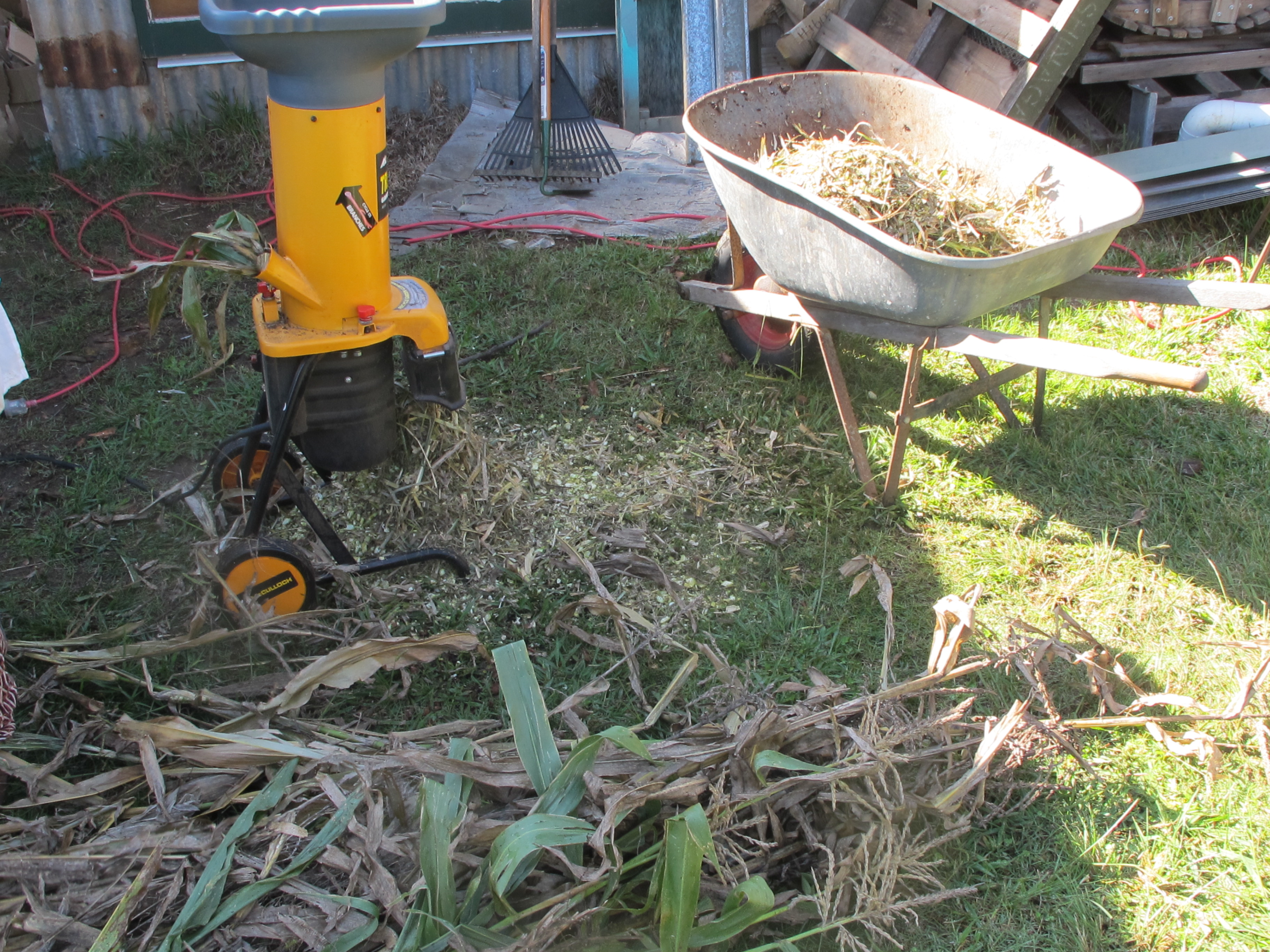 The lovely and I have been making compost for the garden, for the winter mulch. Shredding up all the old corn stalks and other past-their-best veggies and weeds. It all goes int the compost ring with a little manure, the mixture of dried leaves, shredded stalks and soft wet weeds seems to get fermenting pretty rapidly and drops to half its volume in a few weeks. I know that we ought to break up the pile, mix it all up and re-instate it all back into the wire bin to get it fully rotted really fast. But this is real life and we just don’t have the time. It all seems to rot down well enough without the extra effort.