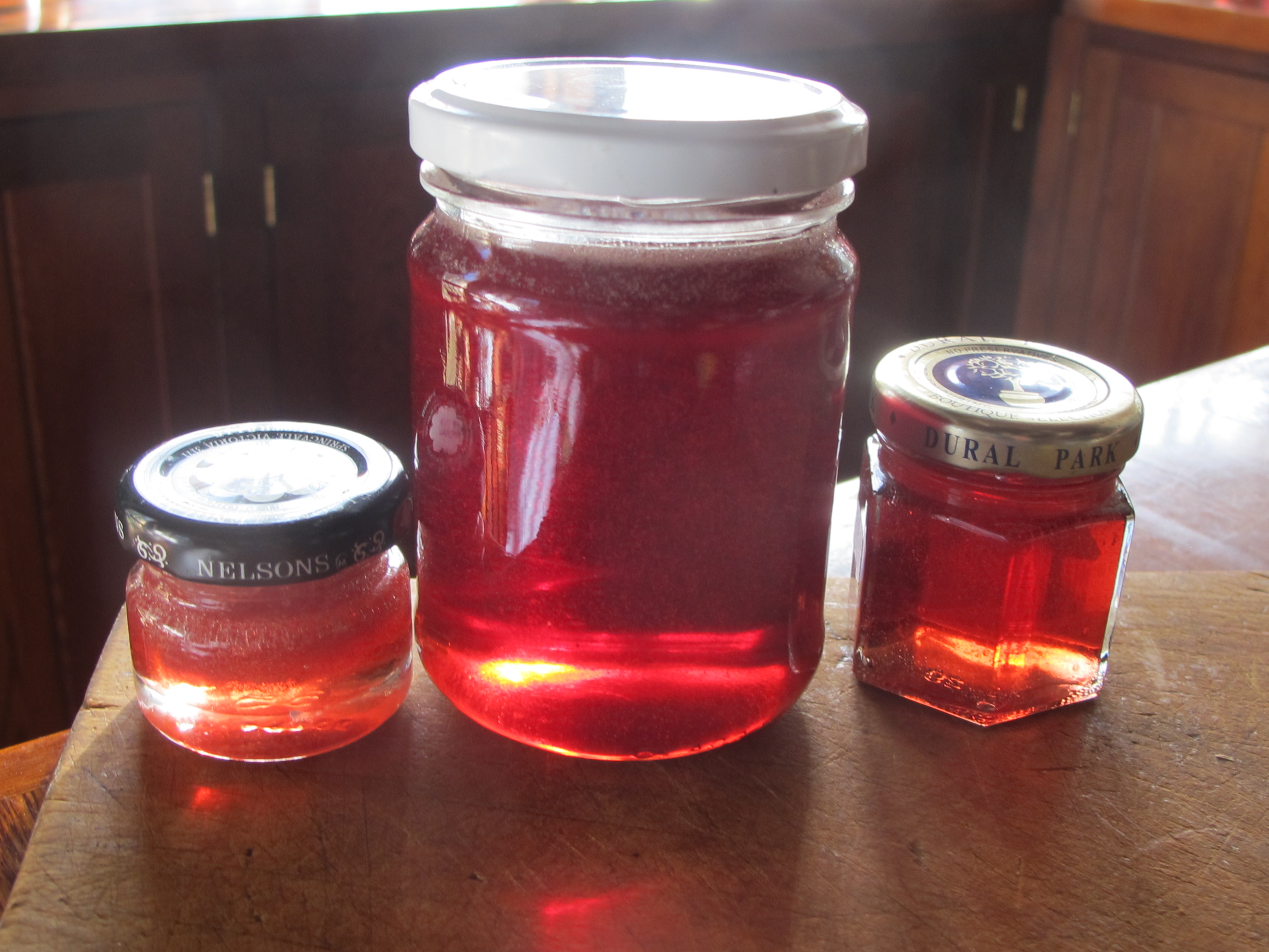 The Lovely makes a few jars of Lillipilli jelly for later on in the season, but we start to eat one of them straight away, it’s just so nice, and all from our garden.This is the result of our two partial days work, picking, washing, boiling, straining, adding sugar and reboiling, then dripping the strained jelly. What wonderful colour and flavour, and from an Australian native fruit as well.