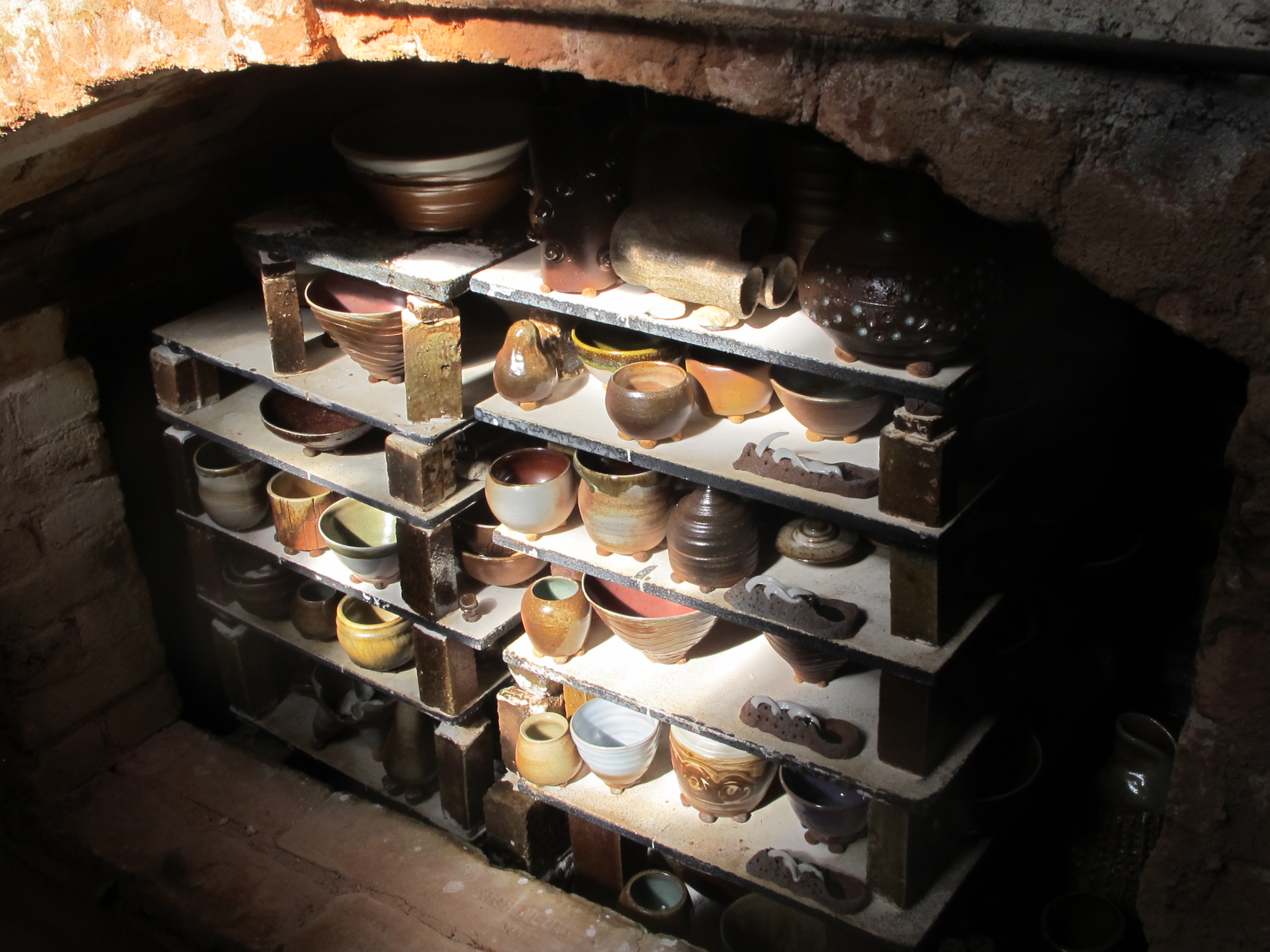 packing the students glazed pots into the kiln. The fired pots ready to unpack