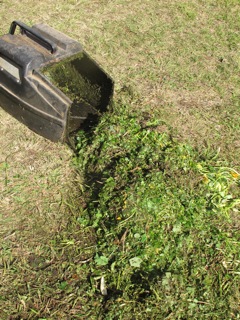 We have pulled out a lot of late summer/autumn stragglers from the garden and composted them. Firm dry material like corn stalks go through the shredder really well and make good compost, but anything that is at all damp just clogs it up, so I’ve found that piling it all up on the lawn and run the mower over it