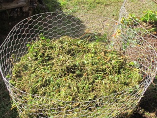 Once it has all been mown over a few times, it’s reduced to damp mush in the catcher, it then mixes really well with the dry material and a bit of chook poo to make very fast rotting compost. We fill the bin to the top in layers and it gets hot in hours, in a few weeks it’s rotted down to half way. We have 3 sites around the garden and orchards where we have these wire rings located. They are constantly being filled, rotted and emptied, every few weeks, as we need the compost for planting out. Shredding and mulching like this breaks down the plant fibre structures and they compost so much faster than if they are just all piled up without shredding.