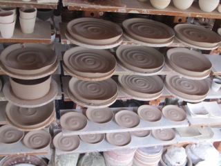 Back in the pottery we’ve both been making plates. The lovely is making slab dishes and I am throwing plates on the kick wheel. I have a few very nice glaze tests coming along using wood ashes and ball-milled granite. They look good but need a flat surface because they are very fluid. When I stiffen them up to eliminate the running, they aren’t the same glaze any more. The best looking glaze tests need to be very fluid to get the most attractive result. So that is why I’ve decided to make plates just now.Plates with a slight turn up at the edge, to allow for the very fluid glaze to pool without running off. Janine has wood fired raku workshops booked for the next 3 weekends so she is busy making pieces for demonstrating during those workshops.