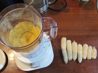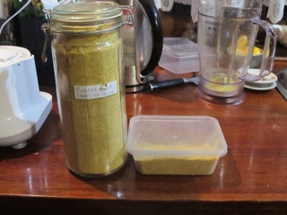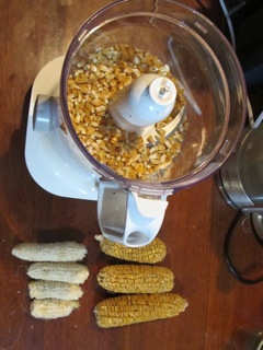 The last few cobs that were left on the corn plants were 2nd cobs. These are usually a lot smaller than the first cob. We left them on and allowed them to dry off, then collected them before we shredded the stalks. I finished drying the cobs in the sun in front of the kitchen window. After a few weeks they appear to be quite dry and shrivelled. I decide to put the kernels through the blender and make some corn meal for polenta. I end up with two very nice meals of ragu and polenta, plus a bit more than a large jar full of corn meal for more warming meals over the coming winter. Two cups of water to one cup of polenta, seems to work quite well and makes enough polenta for the two of us. It’s a bit dull and dry by itself. It needs some sort of sauce to lubricate it. I’ve tried it a few different ways and I like it better with a little cheese added in.