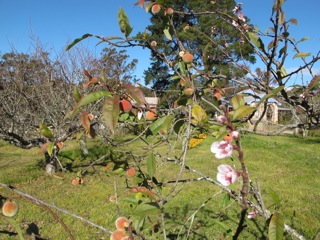 It has another crop coming along and is also flowering as well. It’s quite mixed up! I don’t know what to make of this tree. It’s the only one that is acting this way. Very strange. The variety is Sherman’s Early 3-1. and it was planted in 2006, so it is 8 years old now, and has fruited well for the past few years, but this is the first time that it has tried to flower and fruit all year round. Despite the cold weather, it still persists in retaining a few leaves. I can’t understand how it can get enough energy from those few leaves to ripen a crop of fruit?