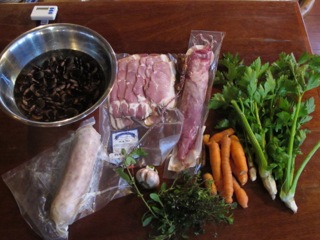 He is a good Chef and has made a hand-made pork sausage that will go very nicely with our home grown and dried beans and vegetable mirepoix as a base for the cassoulet. We don’t have ducks here anymore so we will make it without the duck. Well, we are in Australia after-all, so it doesn’t have to be exact. It’s the thought that counts, and today we are thinking of our friends in France. Cassoulet was traditionally a dish made from what was available at the time of the season. We have dried beans left over from the Summer excess. We also have some tomato/caps/onion/garlic sugu in vacuum sealed jars these can be mixed with carrots, celery and a bouquet-garnet of fresh herbs from the garden. It’s all looking good.