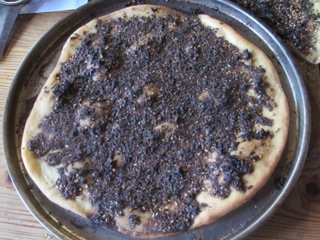 Cut half a dozen stalks of rhubarb into 50mm. lengths and press into the batter and sprinkle with another 50g of hazel nut meal, sprinkle with a little bit more sugar.