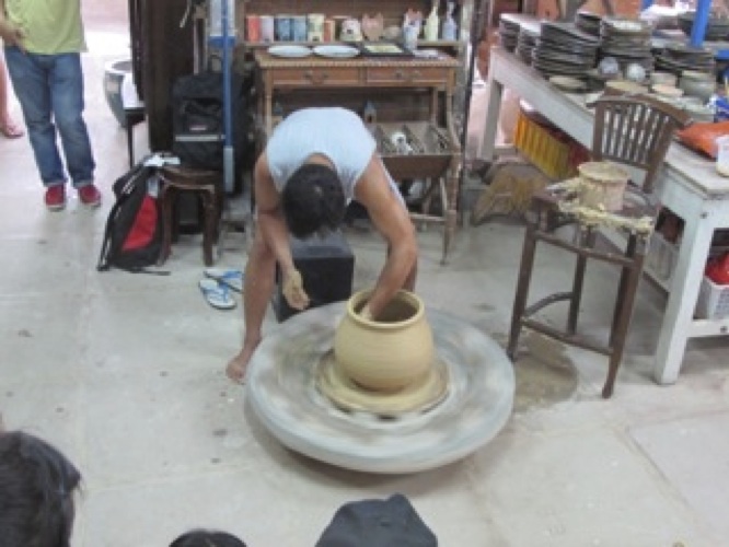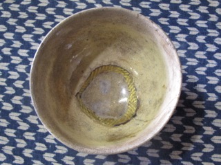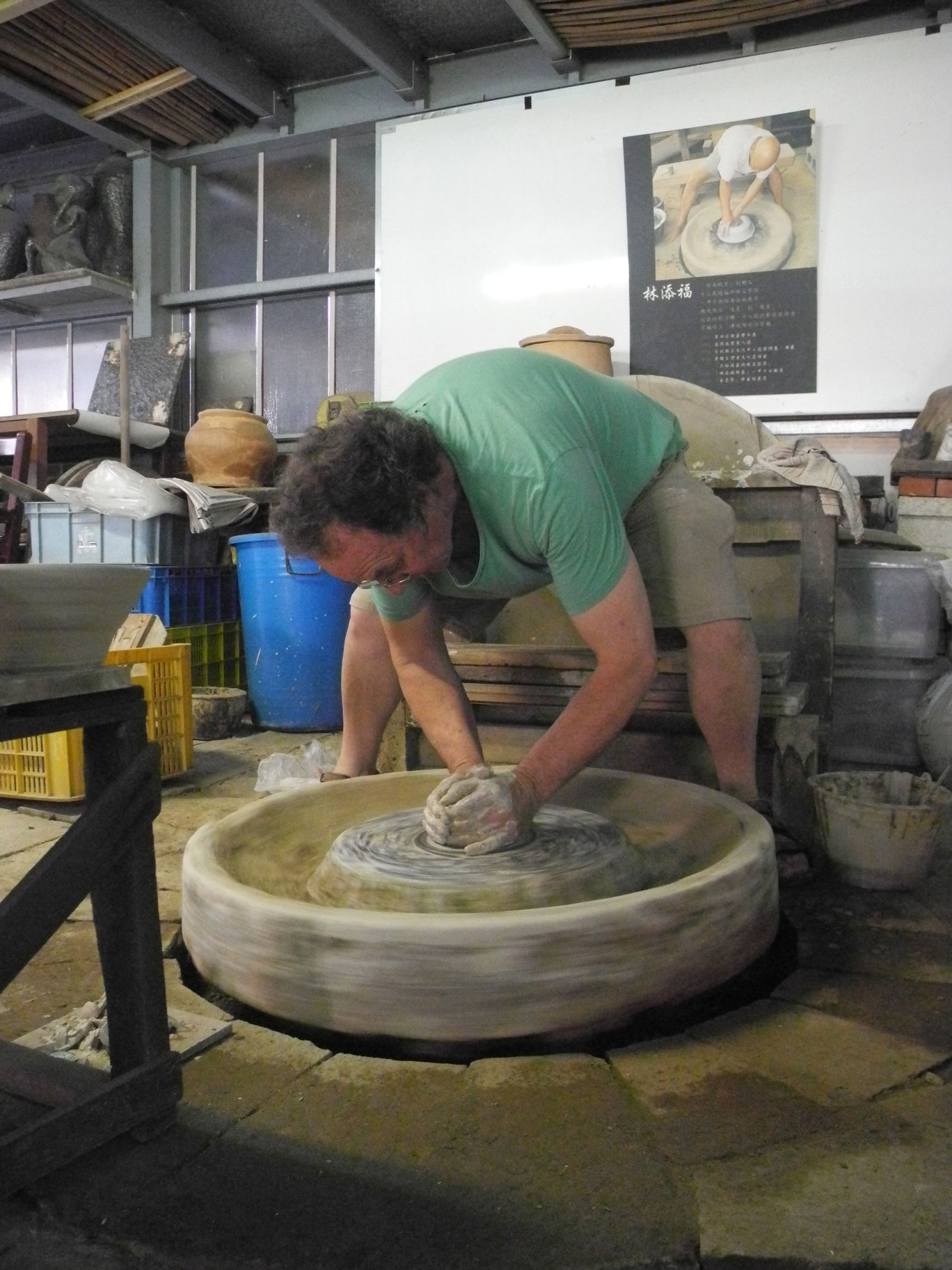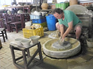 I choose to use the very old, traditional, floor level, 4ft dia. wide, kick wheel. It is essentially a very heavy flat disc. You kick it up to speed with your foot and the momentum keeps it going. You then bend over it, legs akimbo, in a torturous way that can’t be too good for your back, and throw the clay into a pot, as best that you can. As the wheel slowly looses momentum. You have to stand up and kick the wheel up to speed again to give it enough momentum to finish the pot. I made 7 bowls ‘off the hump’, from one big lump of clay, in this way. I was quite surprised that they came off quite well. I’m used to using a kick wheel at home, but not one like this! So the transition wasn’t too hard. However, I’m glad that it was only for 15 mins or so. I don’t think that my back would last all day working in this method.
