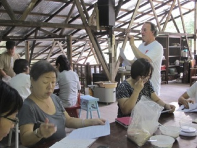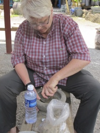 We all sit around in the shade and crush the samples. It’s very boring work, so I’m really pleased to have some wonderful, helpful people sharing the work load with me. The day before my Masterclass is due to start, many of the participants have turned up, they are here for the whole event and are happy to put in an hour or so to help me get it all done. I am very grateful. We only have one of my home-made stampers and 5 granite, food-grade mortars and pestles from the markets to work with. But with so much good will and great helpers, it all gets done. I couldn’t have done it all just by myself. Not in this time frame. So thank you very much to all those who helped me. I’m so grateful.