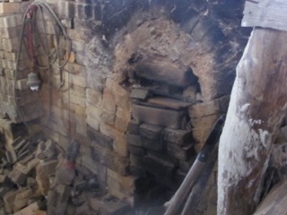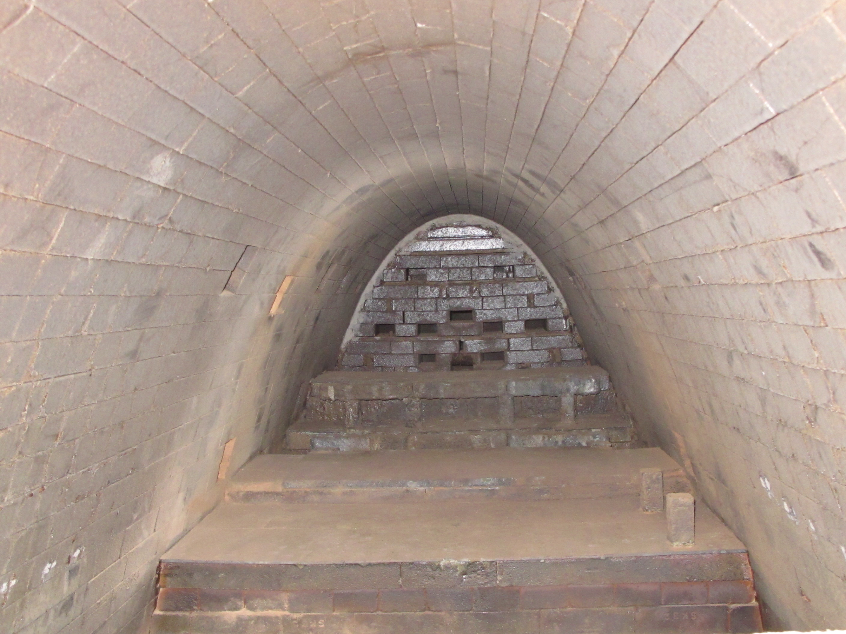 It’s a marvelous old structure, built into the slope and mostly underground to get the earth as support for the arch that runs the full length of the kiln. Just the stoke holes are visible at floor level. The kiln is 1.8 metres high inside, but only 500 mm. is visible above the elevated ground level.