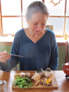 Tatsuya San takes us for a coffee at the local ‘organic’ cafe, ‘Hatakenowa’. It is really very quiet and nice in its back-lane location, a lovely ambiance. The young lady who runs it has a very gentle demeanour. We like the feel of this place a lot. The lady tells us that she will be serving lunch here on Saturday. A full vegan lunch. We decide that we will go. We do and it is really good.“A Mecca called Onda” – revisited, for the first time