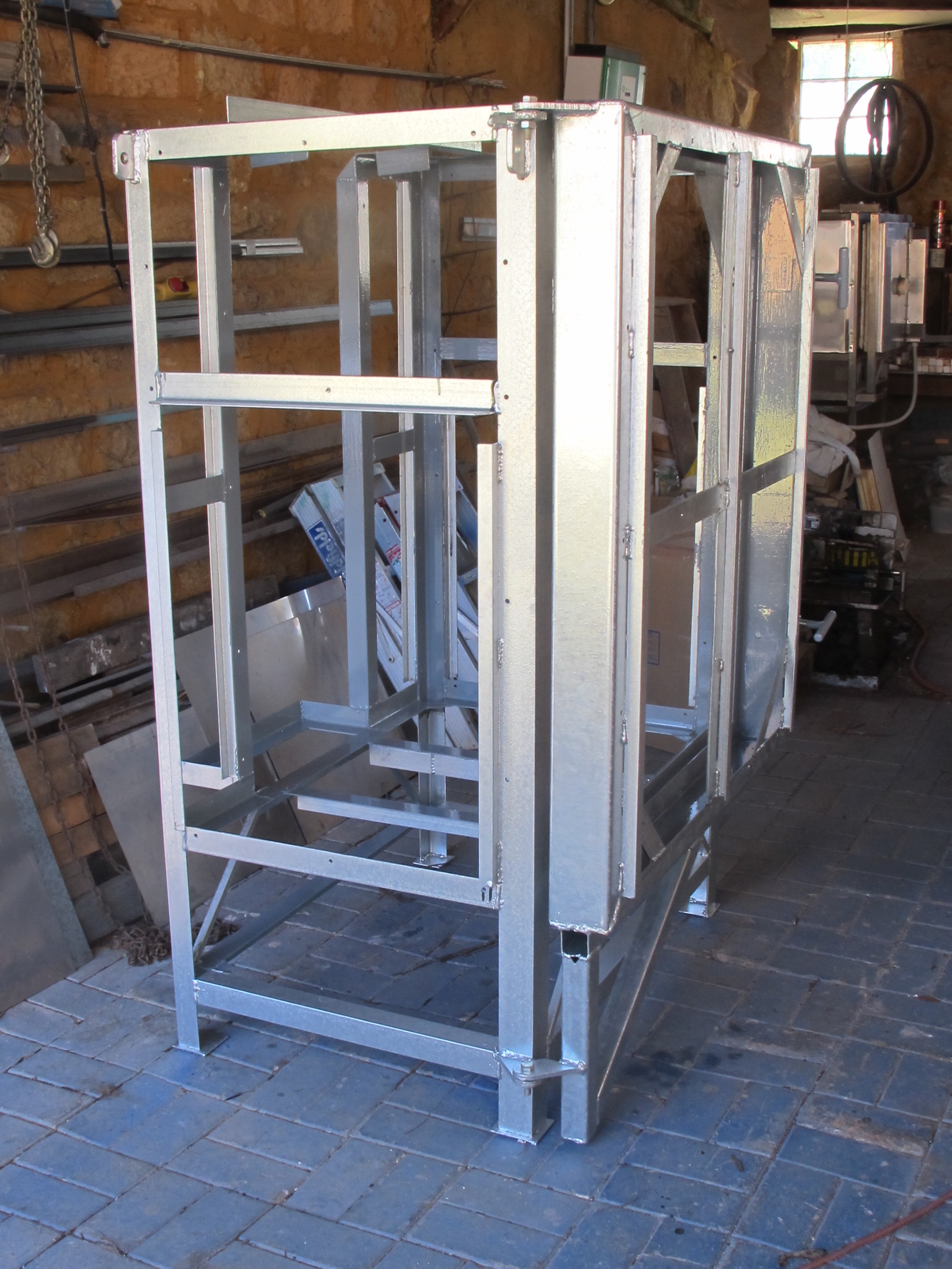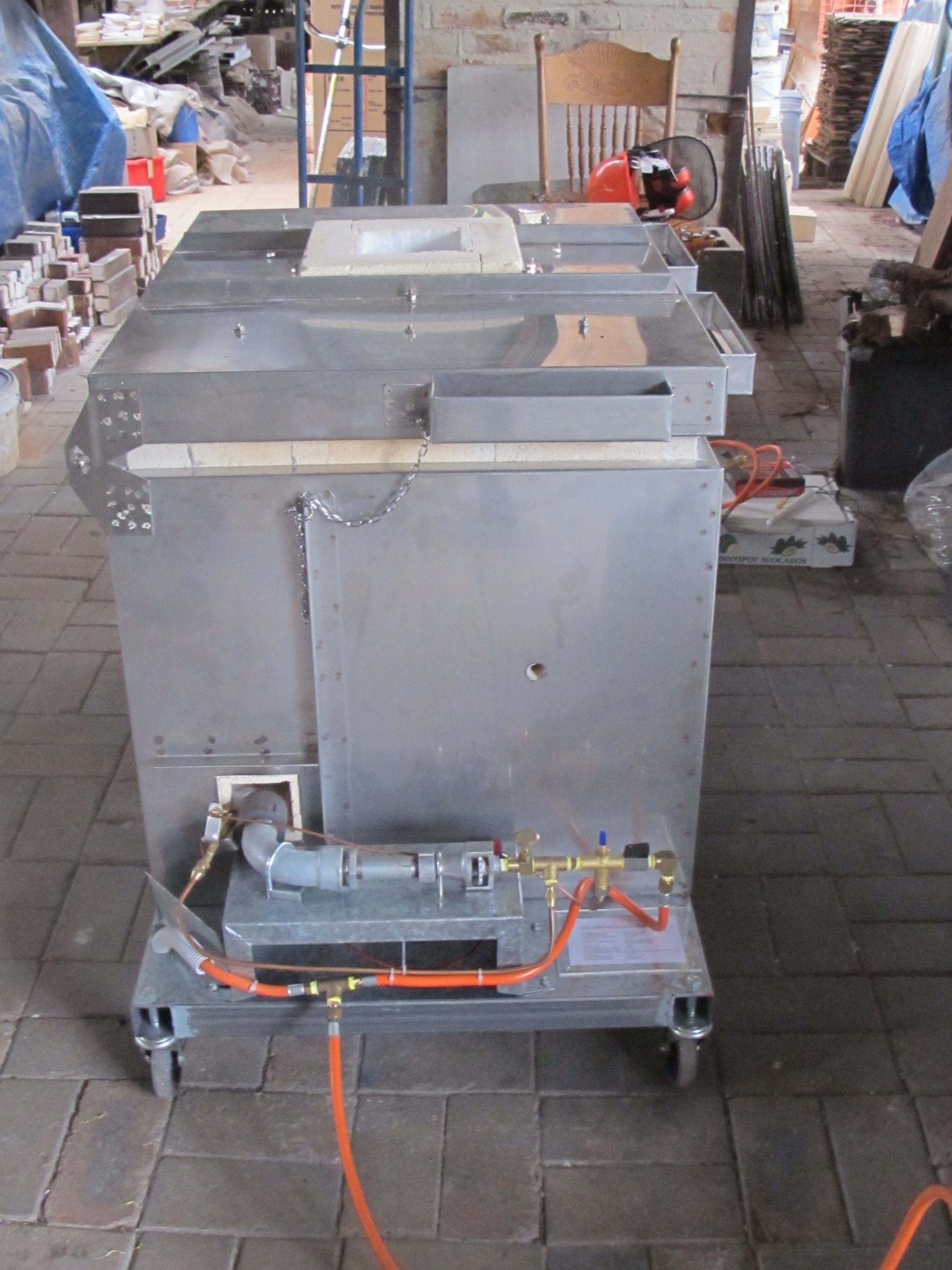 I had a kiln ordered for before Xmas as well as one for after Xmas as well, while the first one was at the galvanisers, waiting to be dipped in molten zinc to permanently rustproof it. I spent the waiting-time, and there is always waiting time at the galvanisers, 3 weeks is usual and longer nearer to Xmas. I spent this time productively making a small re-locatable kiln on castors. This one is for a potter who only has the use of one arm, so everything had to be designed to be flexible and achievable one-handed. This kiln is designed to use 2 quite small and thin kiln shelves, so that it can be loaded with one hand. The kiln has a ceramic fibre-lined lid, which is light weight and hinged, using an adjustable hinge system, that I built, so that it can be lifted simply up into a safe position and held there with chains, just past the pivot point. As the ceramic fibre on the lid seal compresses the hinge can be adjusted to allow for the change in height, so as to maintain a perfect seal. The gas burners are self-igniting using a piezo-electric ignition system that can be operated along with the thermo-electric safety switch, all with one hand.