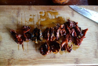 I start by selecting out all the bird-damaged, rain-split, sun-burnt and otherwise affected and just plain over-ripe or undersized tomatoes. Paring them down and cutting them in half. I rub them with olive oil and dress them with a sprinkling of salt, then pop them into a low oven to dry a little for a while.