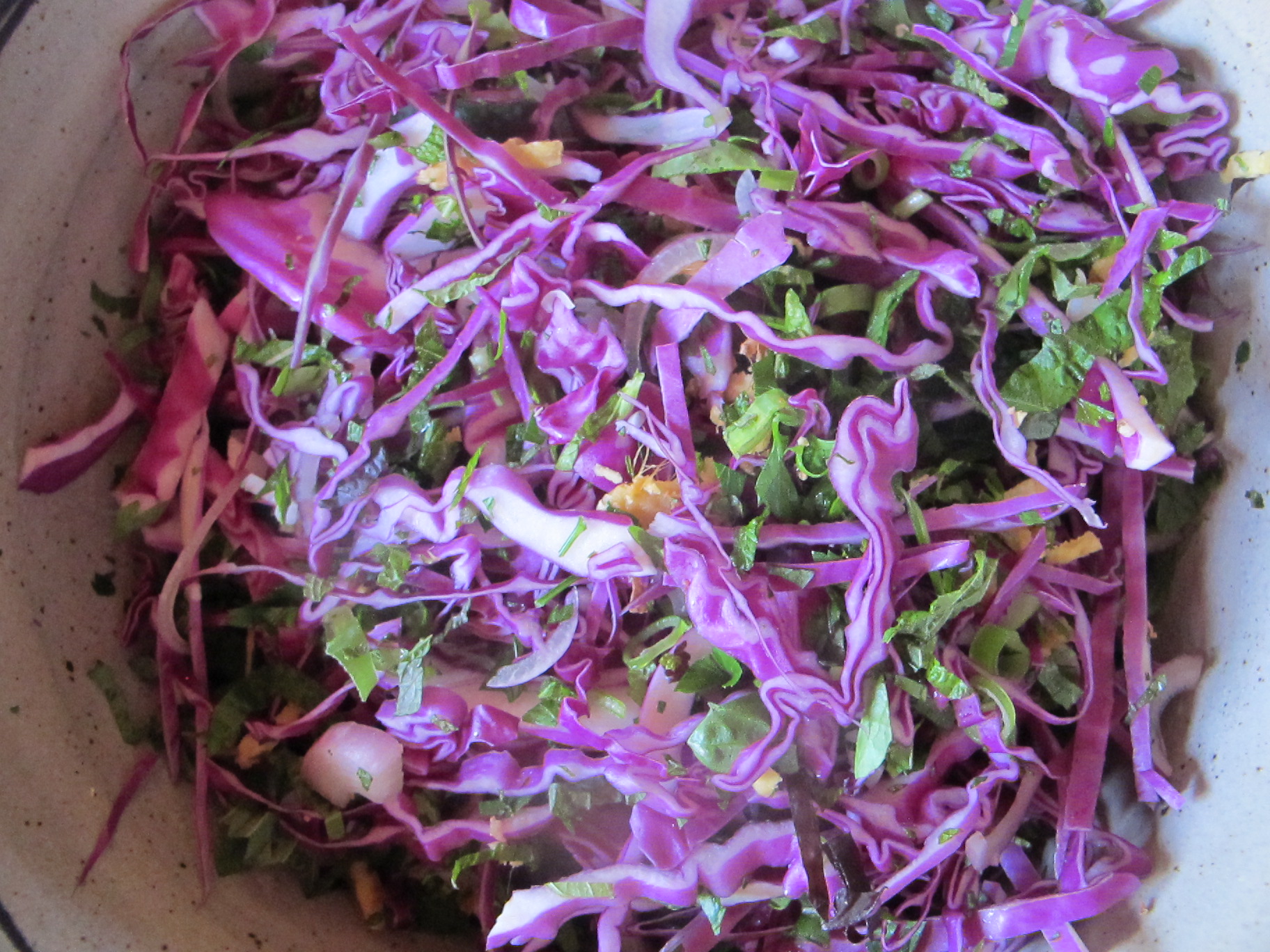 Add some finely sliced Shallot or any other mild onion and some intensely flavoursome Shiso leaves. The green variety seem to have more essential oils than the red and is more aromatic, but the red one looks so terrific in the mix, especially if you are using green cabbage. Next add in plenty of very finely shredded mint leaves and some grated ginger.