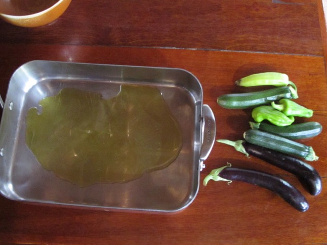 In the kitchen the smell of the half baked tomatoes is wafting out and about the house now. I split the zucchinis, capsicums and aubergines. These are our first two aubergines of the season. I lay them all in a baking dish with some olive oil, cover them with the half baked tomatoes and dress it all with a big handful of torn basil leaves fresh from the garden, while The Lovely crushes a few cloves of garlic and spreads it about all over the mix. I tear up a few anchovies and place little bits evenly about the pan. It isn’t pretty. It’s a big jumbled mass of veggies, but it smells fantastic already and I haven’t even cooked it yet.