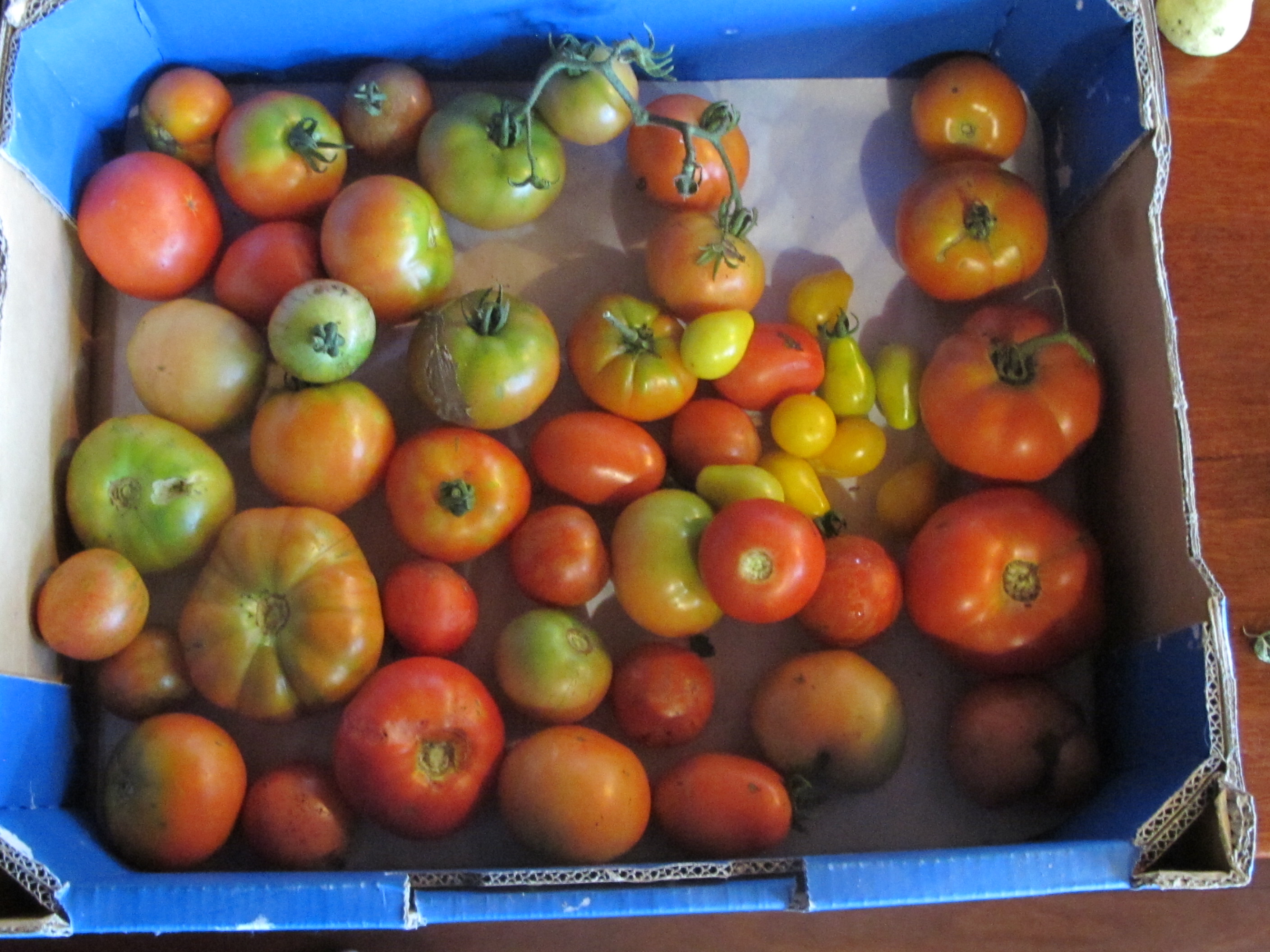 The Earth Mother Garden Girl has been out early, picking vegetables and returns with a wheel barrow full. She comes in with a couple of boxes full of tomatoes, capsicums, aubergines, zucchinis, and more.