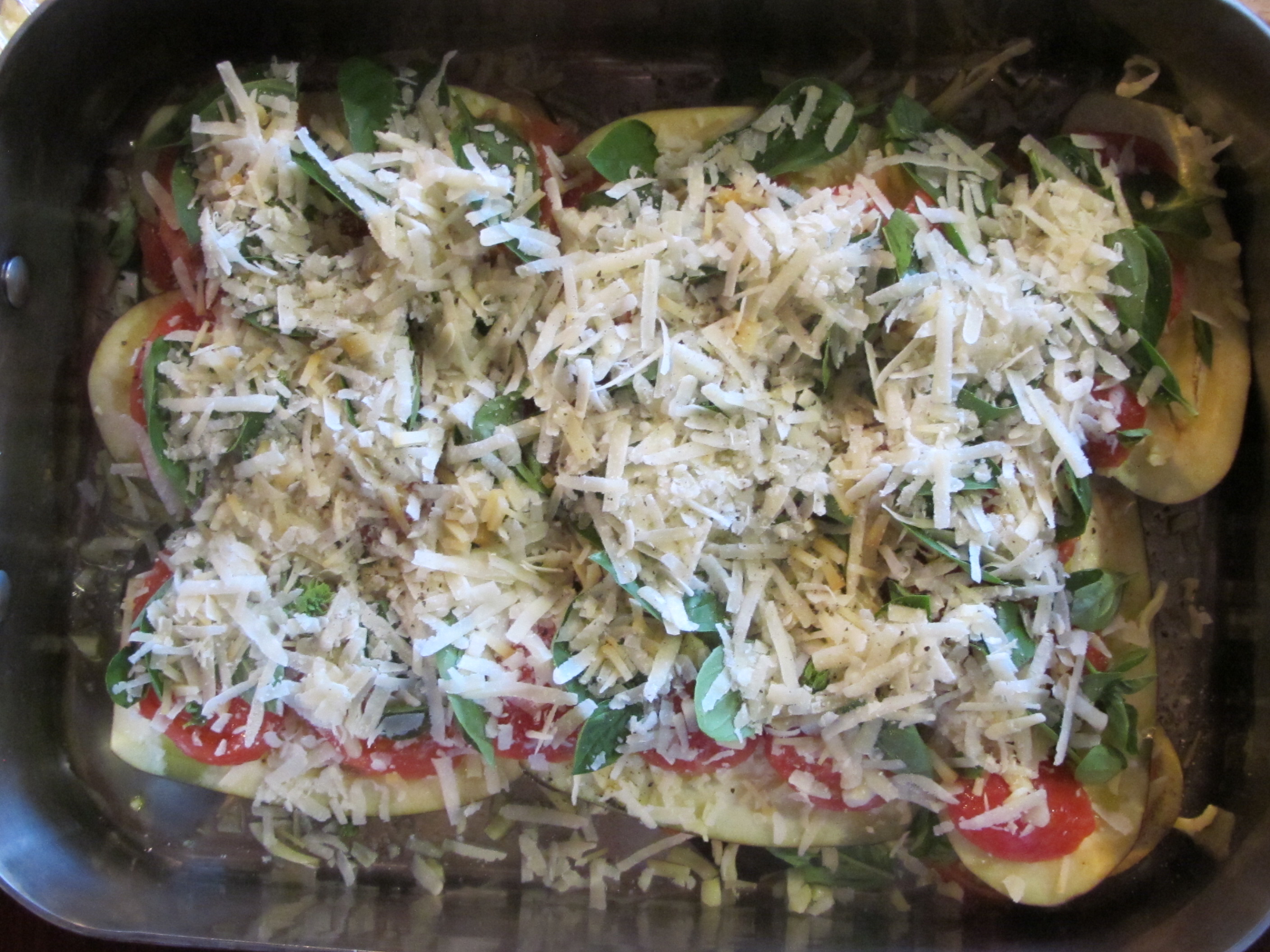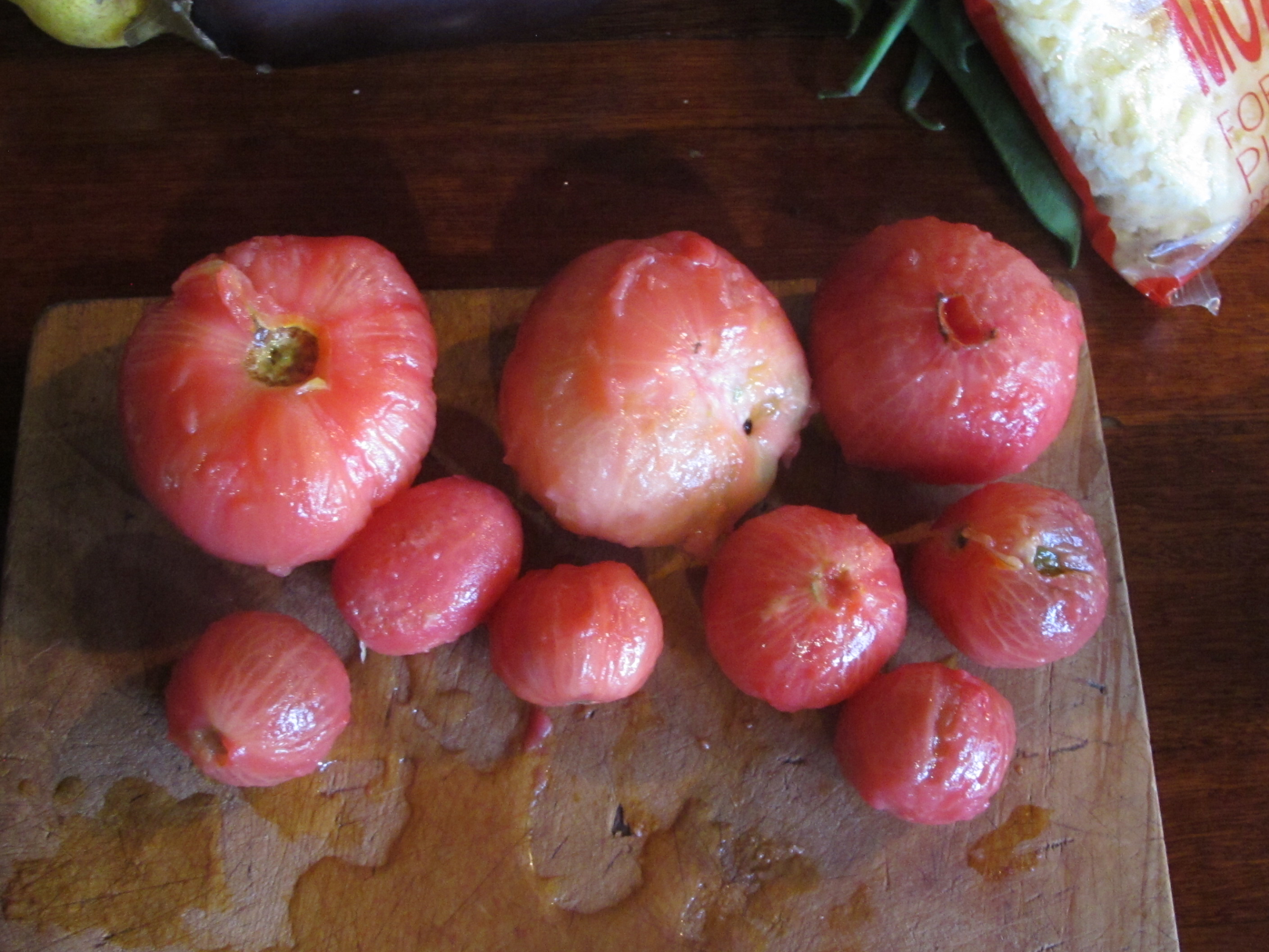 Tomatoes blanched and skinned, sliced and laid over the aubergines with a little olive oil, then sprinkled with torn basil leaves and crushed garlic, finally covered with a jar of our home made tomato, garlic, onion and capsicum sauce. Grate parmigiana on top and bake.