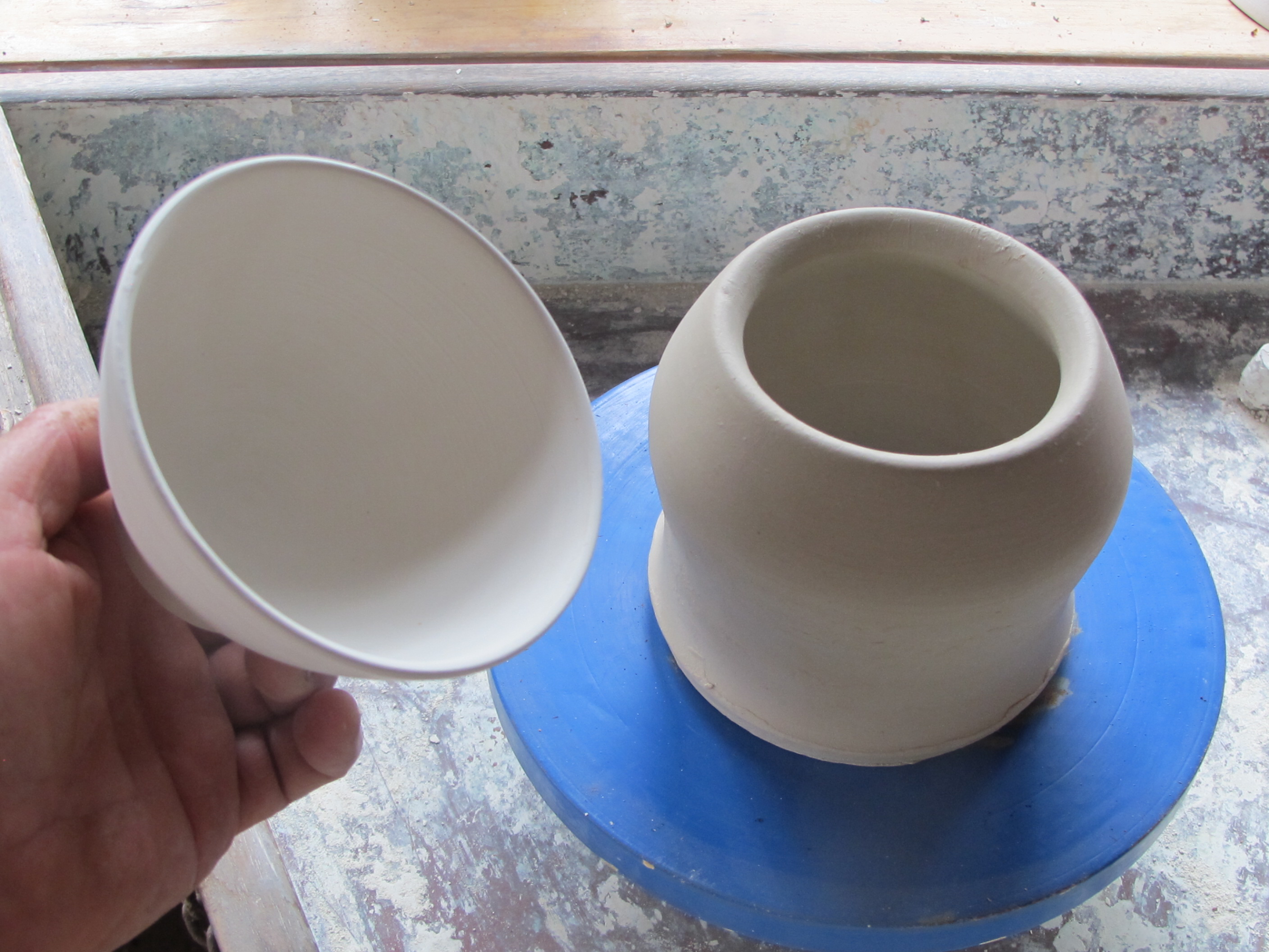 Turning pots bone dry is just a little tricky also, as you need to use a specially designed leather-hard clay ‘chuck’ to hold the pot perfectly and intimately with exquisite contact detailing, such that the bone dry and very fragile rock dust bowl form won’t crack due to the stress and pressure of the turning and trimming. This process can also be quite dusty as well, so measures have to be taken to minimise the dust. I tend to turn while there is still just a small fraction of moisture still in the pot. In workshops where they turn like this day-in and day-out, they install exhaust fans to collect the dust in a dust extractor where it is collected for recycling. Turning dry clay like this is like cutting through chalk. Actually, it’s more like grinding away at a chalk surface and reducing it to powder to reveal a form encased or hidden within.  I’ve come to like turning, it’s the other thing that I’m OK at.