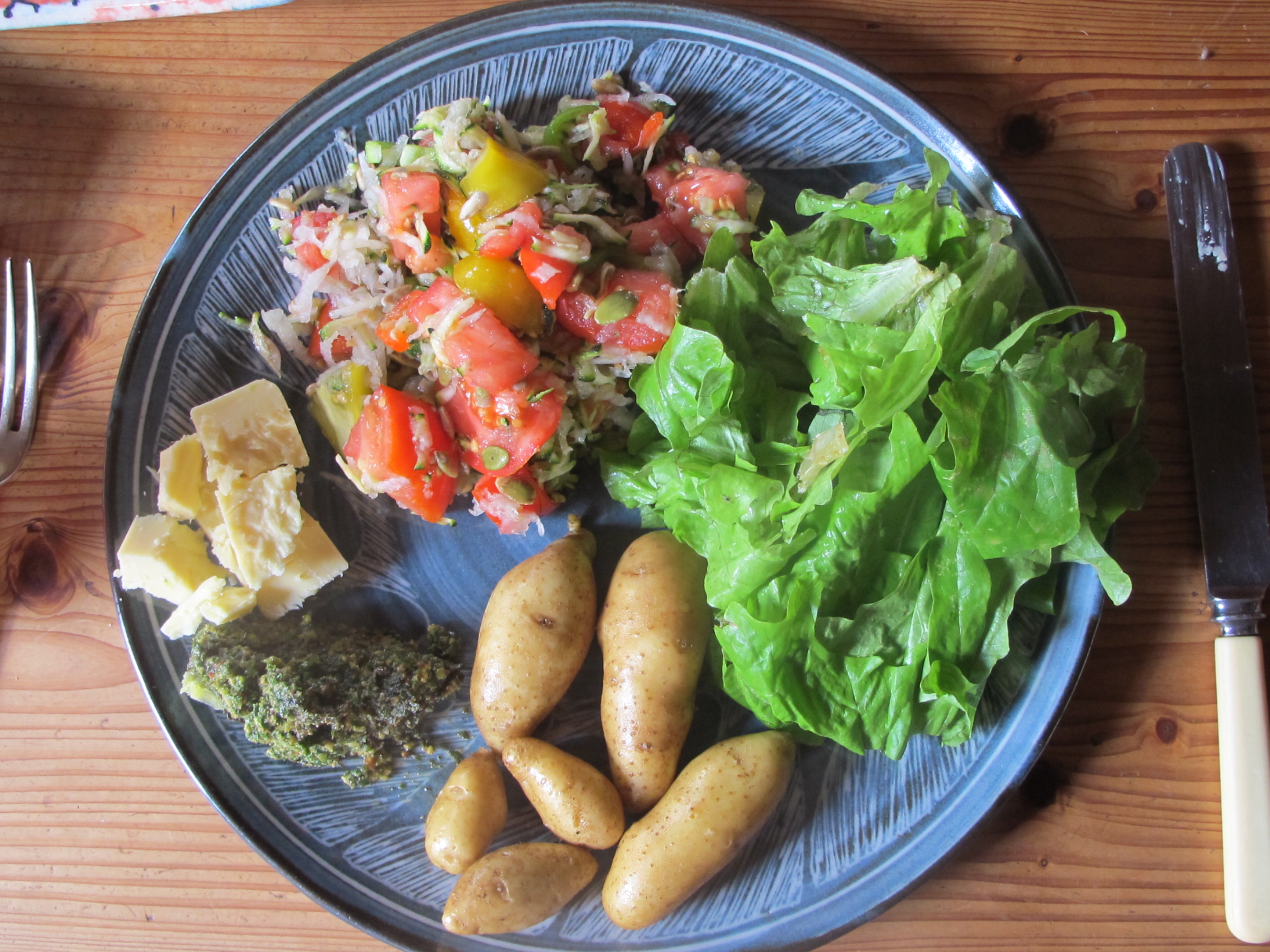 They are nearly all small kipflers, we steam them in bigger batches. Too much to eat at one sitting, then we cool the excess and place it in the fridge for a later time. This is not to save time or money. We do it because cold potatoes are better for you. Fresh steamed potatoes are digested straight away and go pretty quickly into your bloodstream. High GI. Once cooled however, the potato starch is converted to what is called ‘resistant’ starch or ‘butyrylated resistant starch’. It isn’t digested in the tummy or small intestine, but passes all the way to the lower intestine where it feeds the endemic gut flora that like to live there. It makes for a very fertile environment for this good gut bacteria. So, resistance is fertile, I read an article about this in New Scientist twenty years or so ago and reprised recently, I have practised it ever since. Having a healthy and fertile environment for the good gut bacteria is an excellent way to ward off colorectal cancer. I also remember reading that cooking the spuds a second time and then cooling them, converts even higher percentages of the starch into the resistant form. Providing lots of fibre where it’s needed. We don’t ever seem to get around to doing this second cooking and cooling. We already have enough to fill our days. I should change my habits, but I’m resistant.