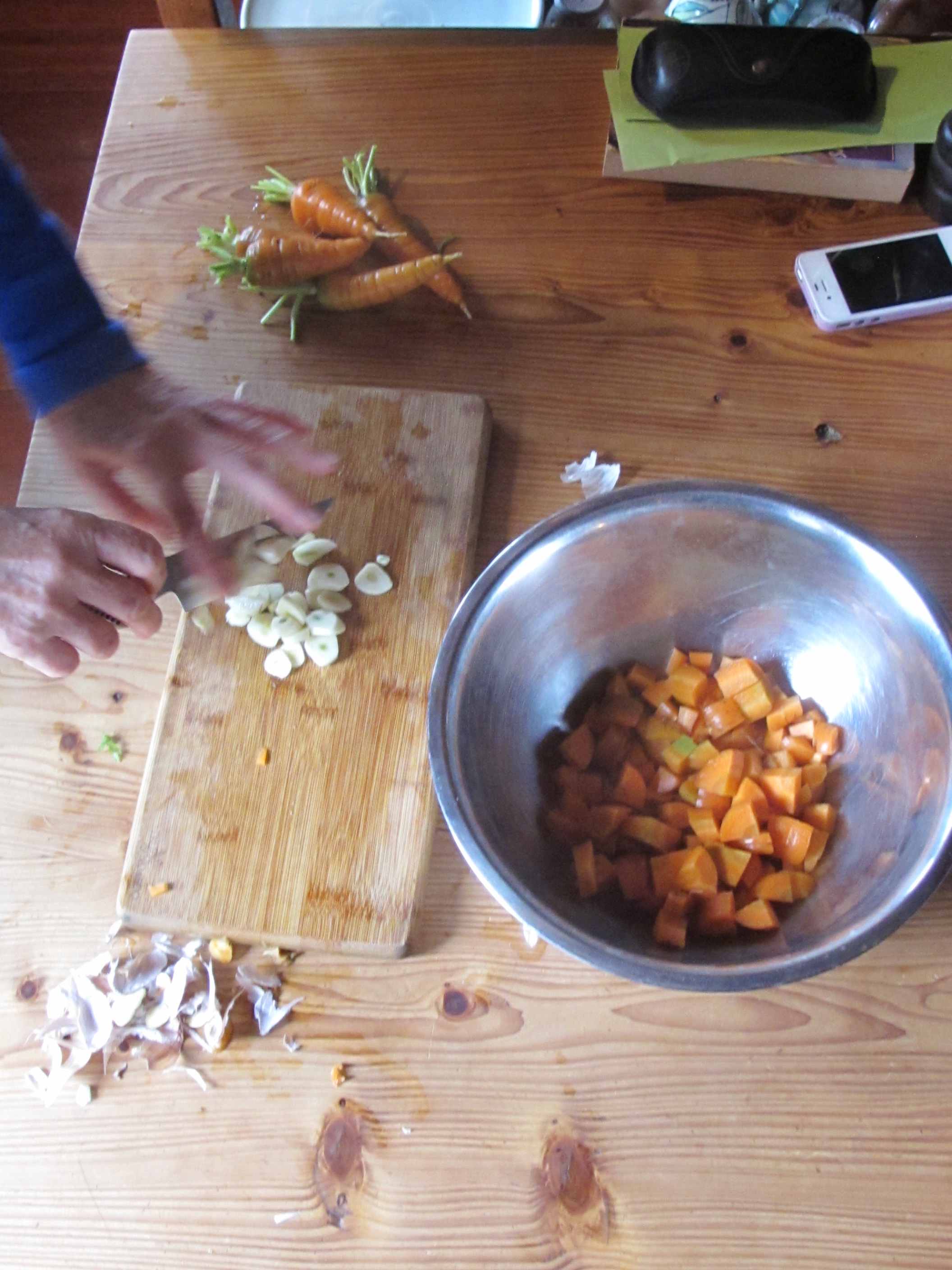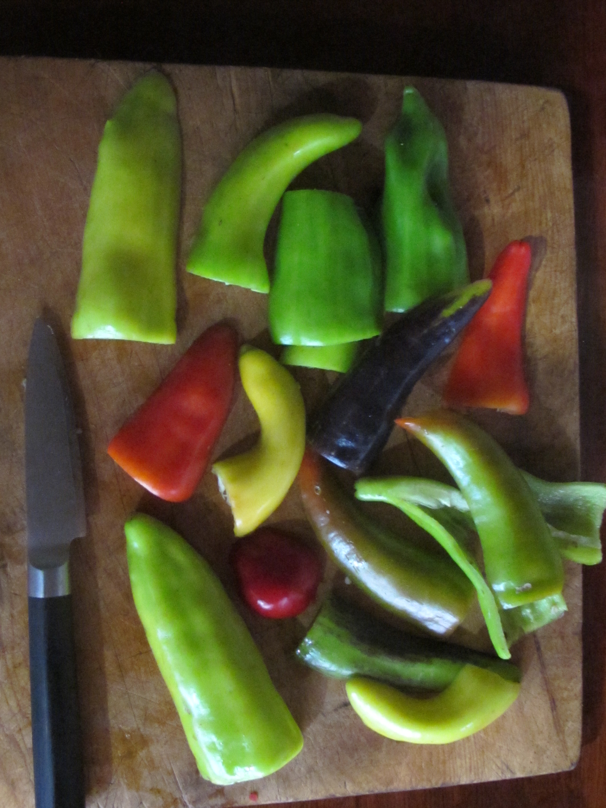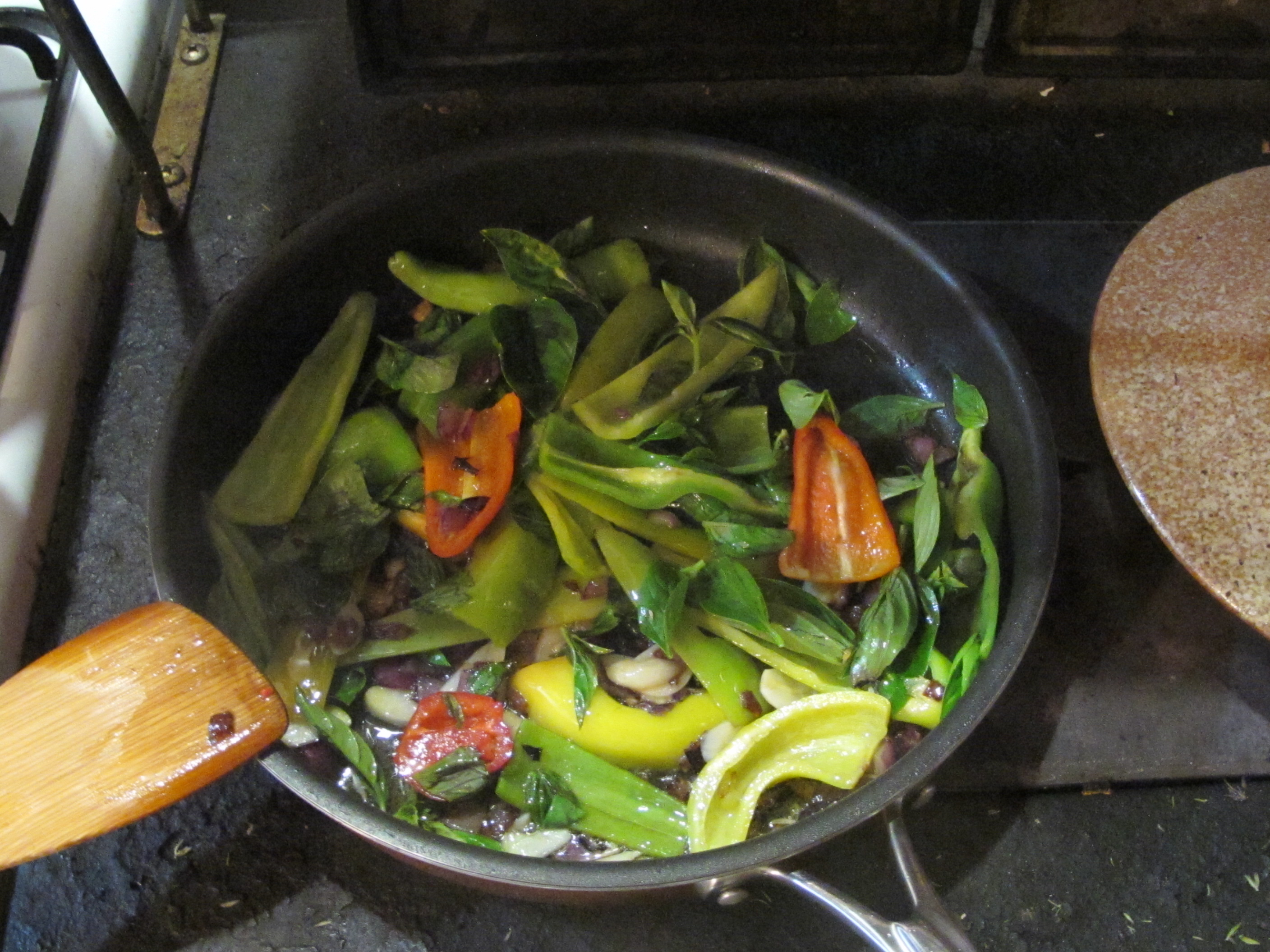 One night we have a dinner of pan fried capsicums with garlic, olive oil, tomato and basil. The next night it is a lot cooler, so the Mademoiselle makes the first minestrone of the season, using our kohlrabi, cabbage and leeks from the garden and our dried beens that we shelled a few nights earlier, with our friend Elizabeth, sitting on the lounge watching the idiot box.
