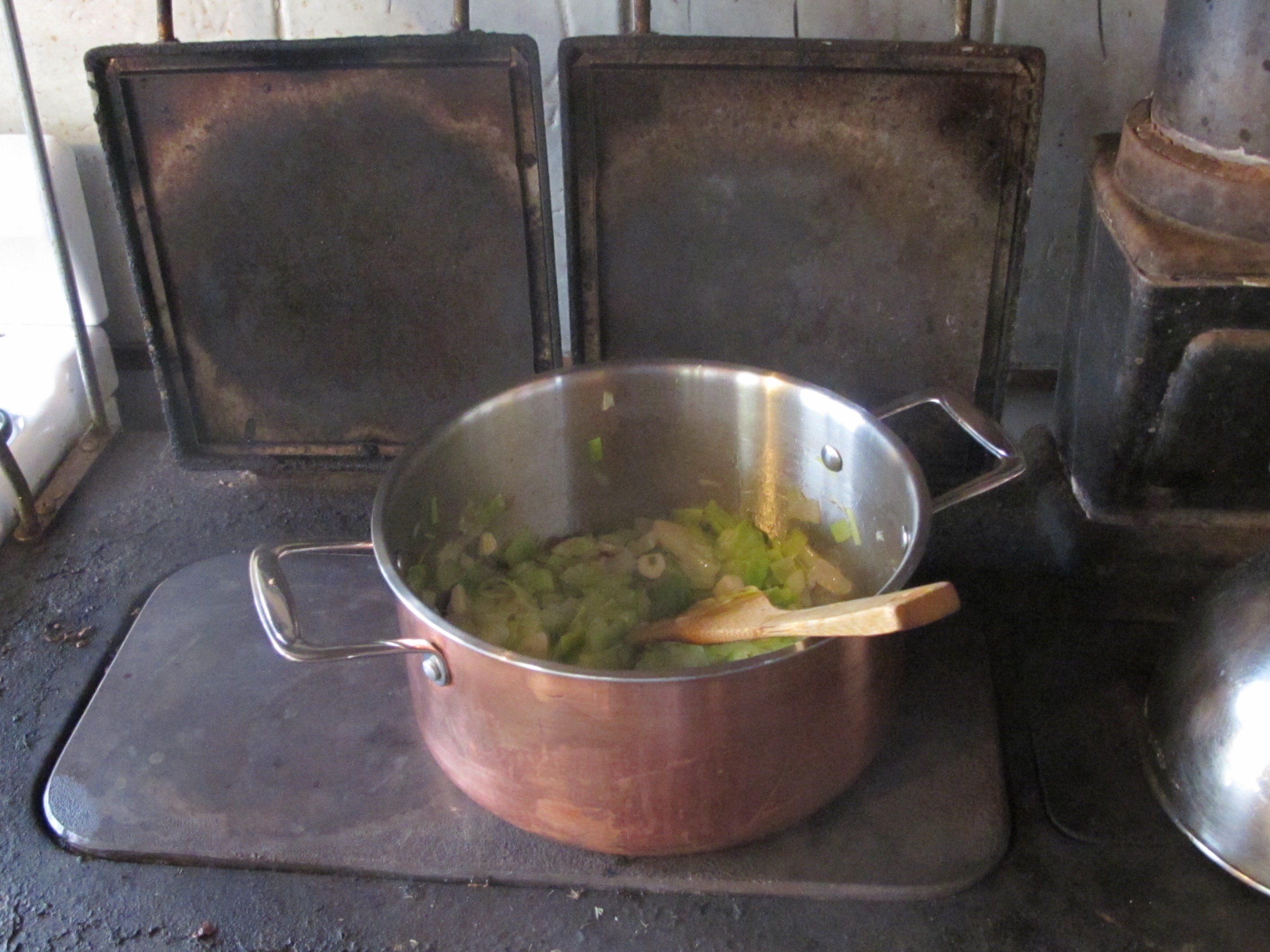 In the evening I start to make a big batch of roasted marrowbone stock. I fill 2 of our 10 litre boilers with the roasted bones and a mirepoix of garden vegetables and herbs. Over the next two evenings,