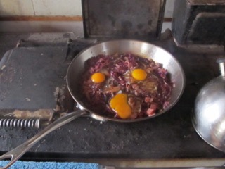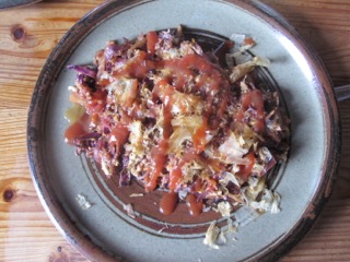 I use the other half of the cabbage to make a kiln builders lunch of okonomiyaki, Japanese style cabbage pan cakes. But on this occasion, without any flour, just held together with a few local organic eggs that we got from our friend Marg, who runs a certified organic garden. I add some saffron milk-cap mushroom from the garden. The first of the season for these mushrooms. I also add some of our pickled ginger and a few of our sun-dried tomatoes in oil. It’s not Kosher Japanese. Just the idea and influence of Japan. We use what we have at hand from the garden and our preserves from the pantry. It reminds us of our Japanese friends and the good times we’ve had together..
