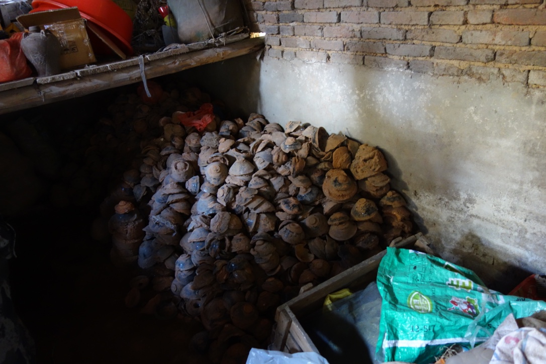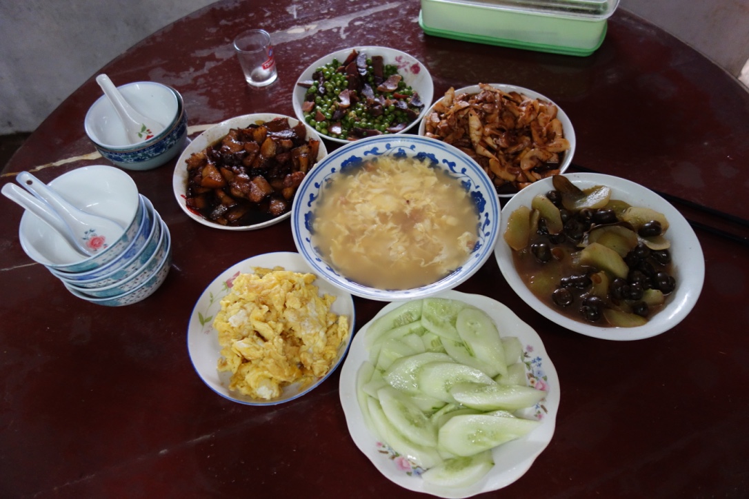 In a couple of ‘bunkers’ in the back room behind him, there are possibly another thousand bowls all stacked up haphazardly waiting their turn to be cleaned and polished ready for sale somewhere. I’m guessing that he probably would like us to buy one, but I already have several original tenmokus before I came on this trip, hence my interest. We are invited to stay lunch and we do. We are even offered home-made wine of some sort that stretches my definition of wine somewhat. I drink a small glassful. That’s more than enough for me, but he insists that I have a refill. I do, just to be polite, but it takes some effort to swallow. After that I have no hesitation in saying NO. I’ve had enough and honor is satisfied. There are sauteed snails, scrambled egg, the usual entrails, bits of pork in black bean sauce and cucumber salad with salt and vinegar.