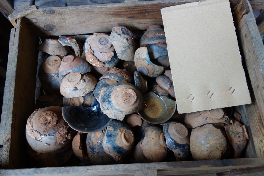 He motions us to follow him and we go back to his house in the village at the edge of the site. We are now sat down at a very finely crafted wooden table set with tea wares and loads of tenmoku bowls and their fragments and shards. We are now all friendly and tea is made and served. He proceeds to show us his collection of shards and almost complete shards. We ooh! and arrh! appropriately and ask if we can take photos. After our umpteenth cup of tea, I begin learn that if you drink the tea, he is obliged to refill the cup. So the only way to end the ritual is the not drink the tea and leave the cup full. My bladder will burst if I have one more cupful! This strategy seems to work and I’m spared any more tea for the time being.