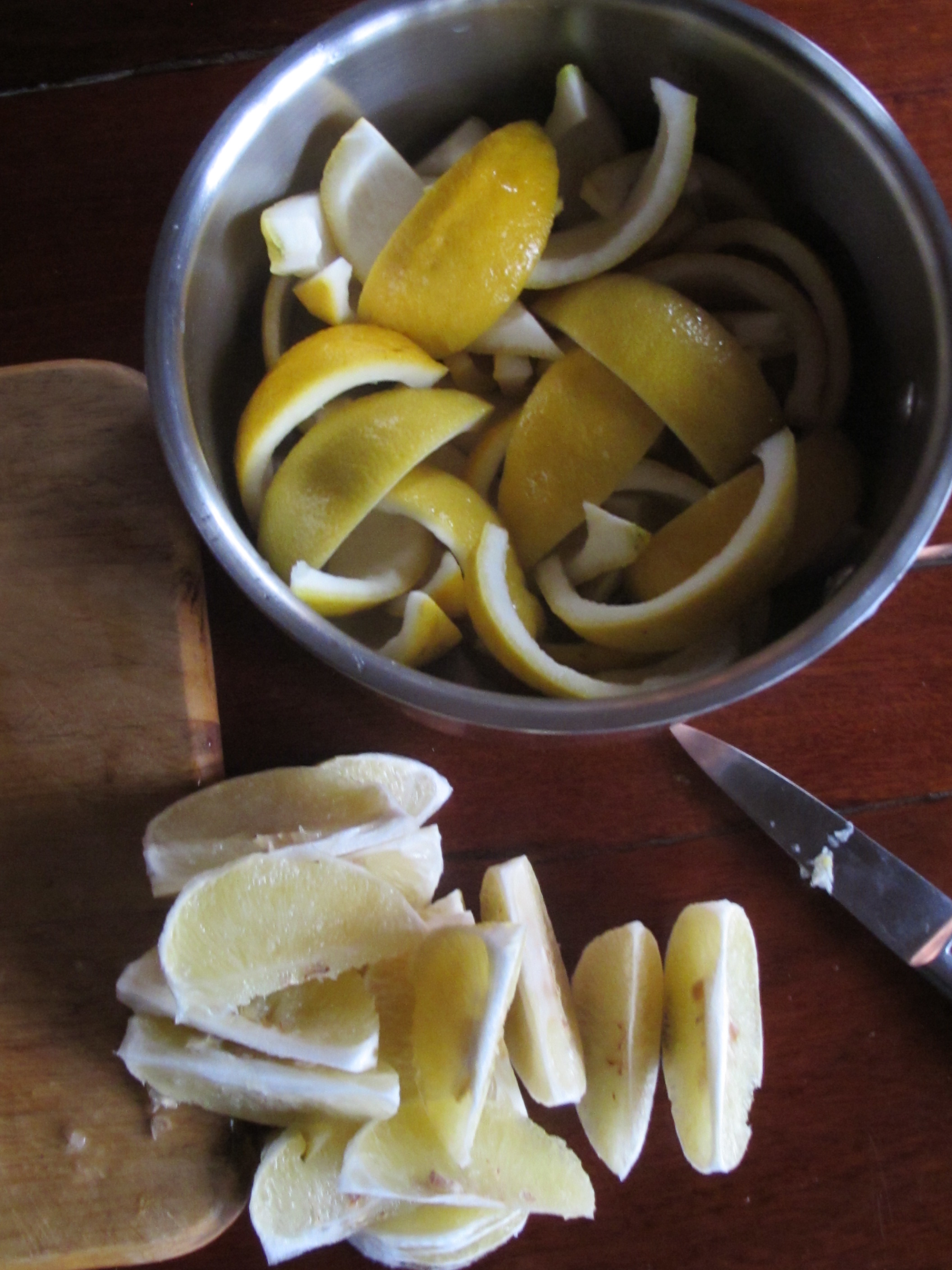 Cut the citron fruit lengthways into quarters and again in half into eighths, cut out the centre of the fruit to leave the white pith and peel.