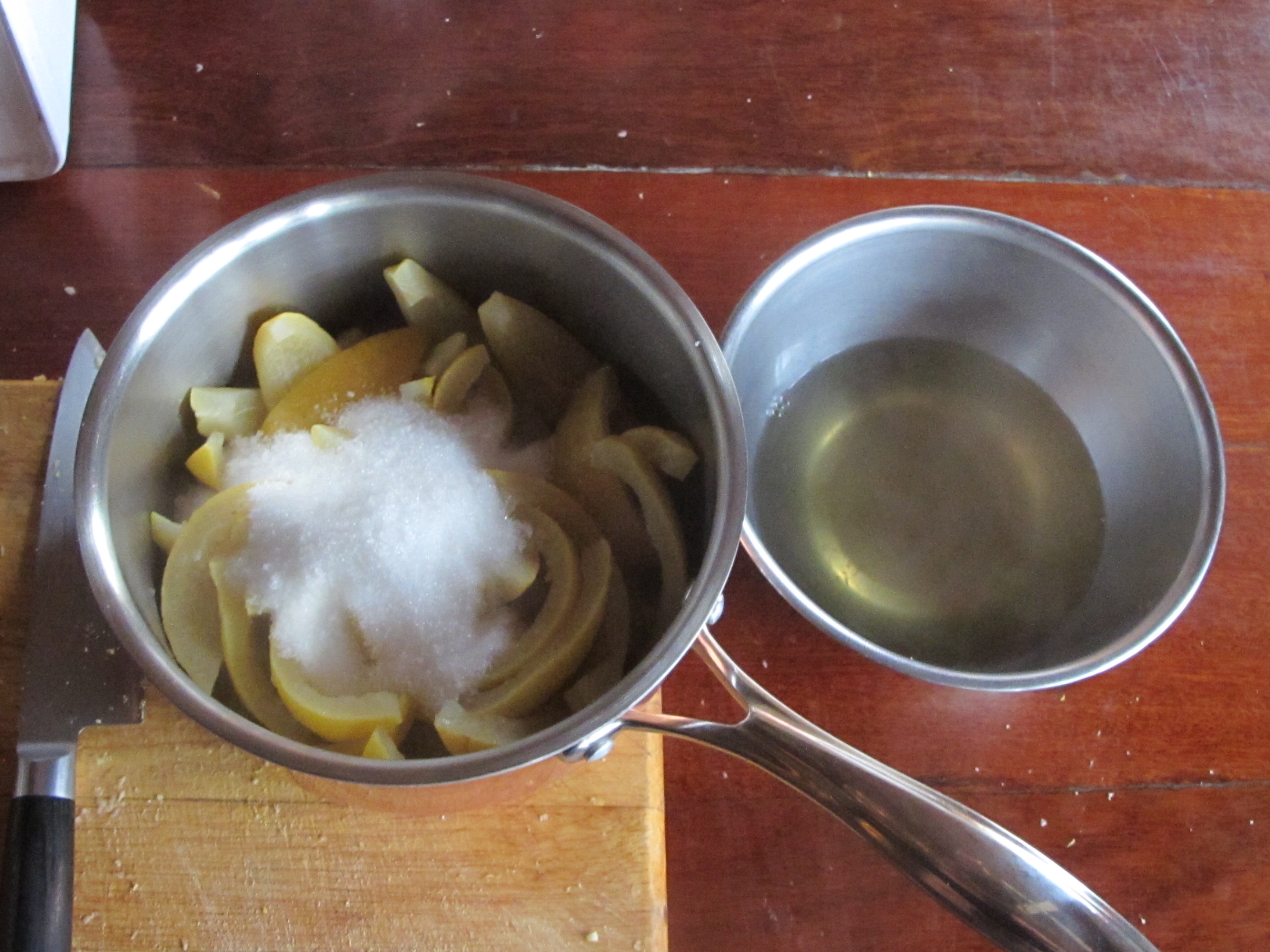 Drain off the water and weigh it. Add 1kg of sugar for every litre of water or part thereof proportionally. Return to the stove and bring back to the boil and let it simmer for another half hour or so. Leave to cool in the liquid over night.