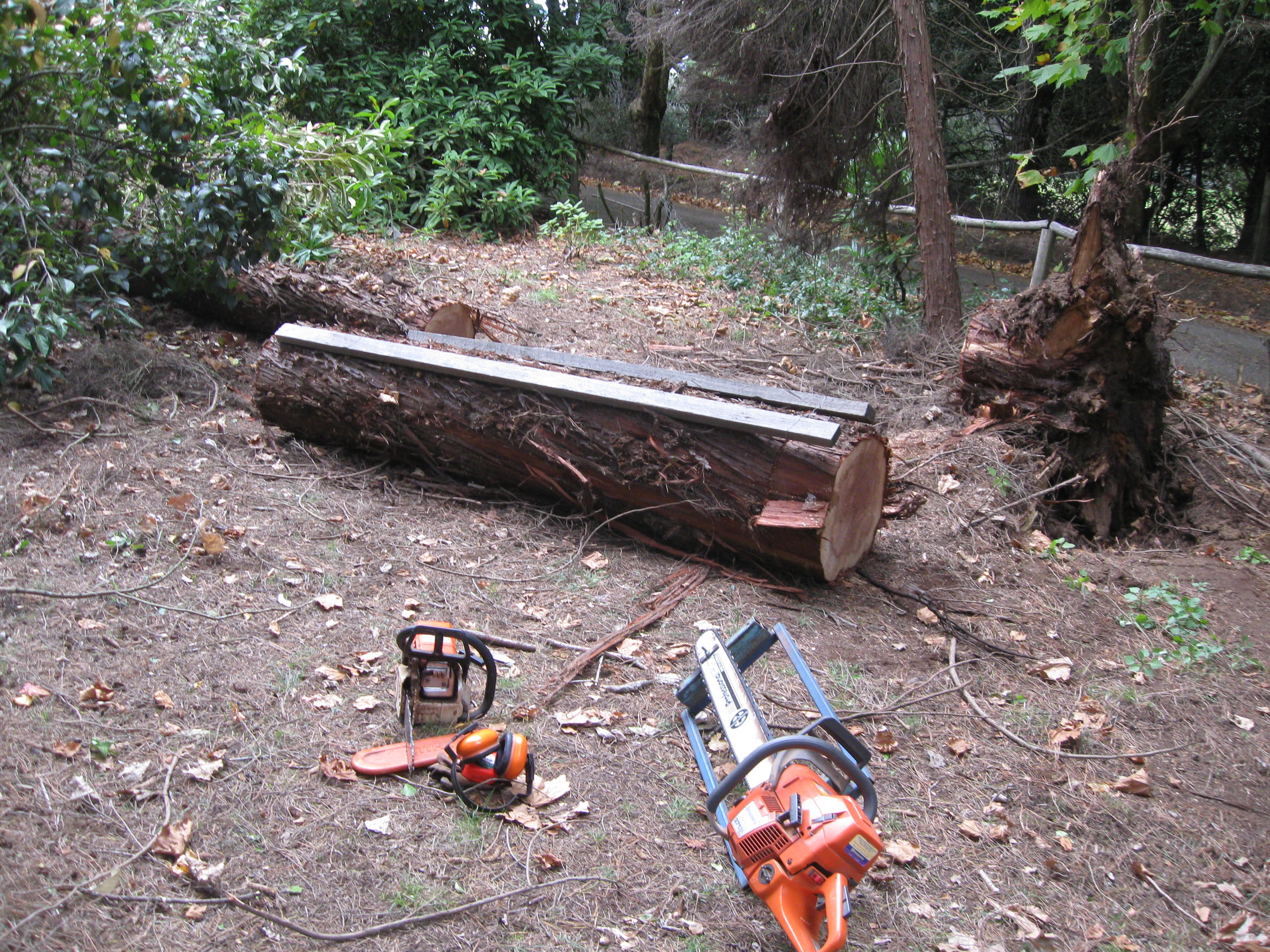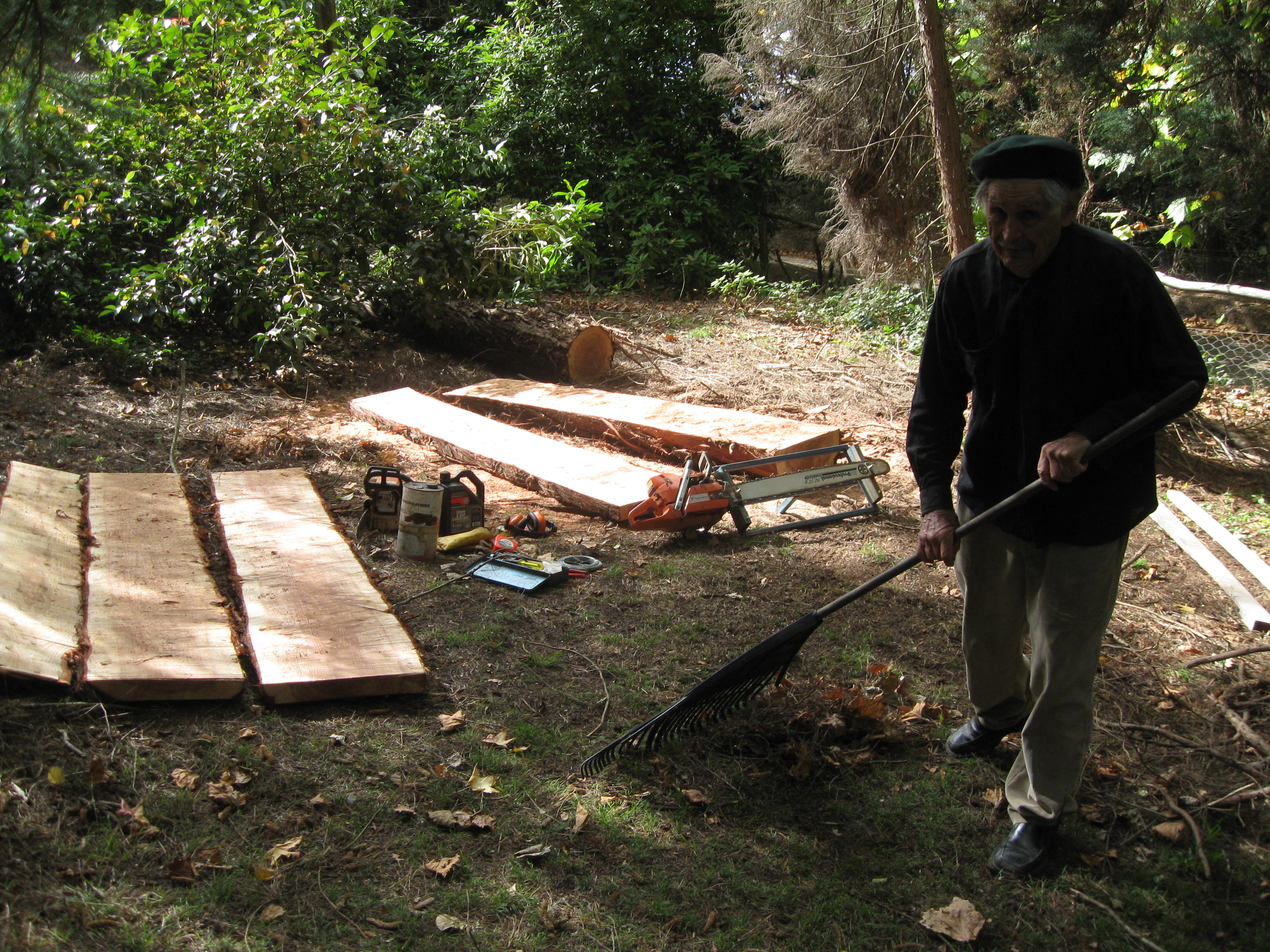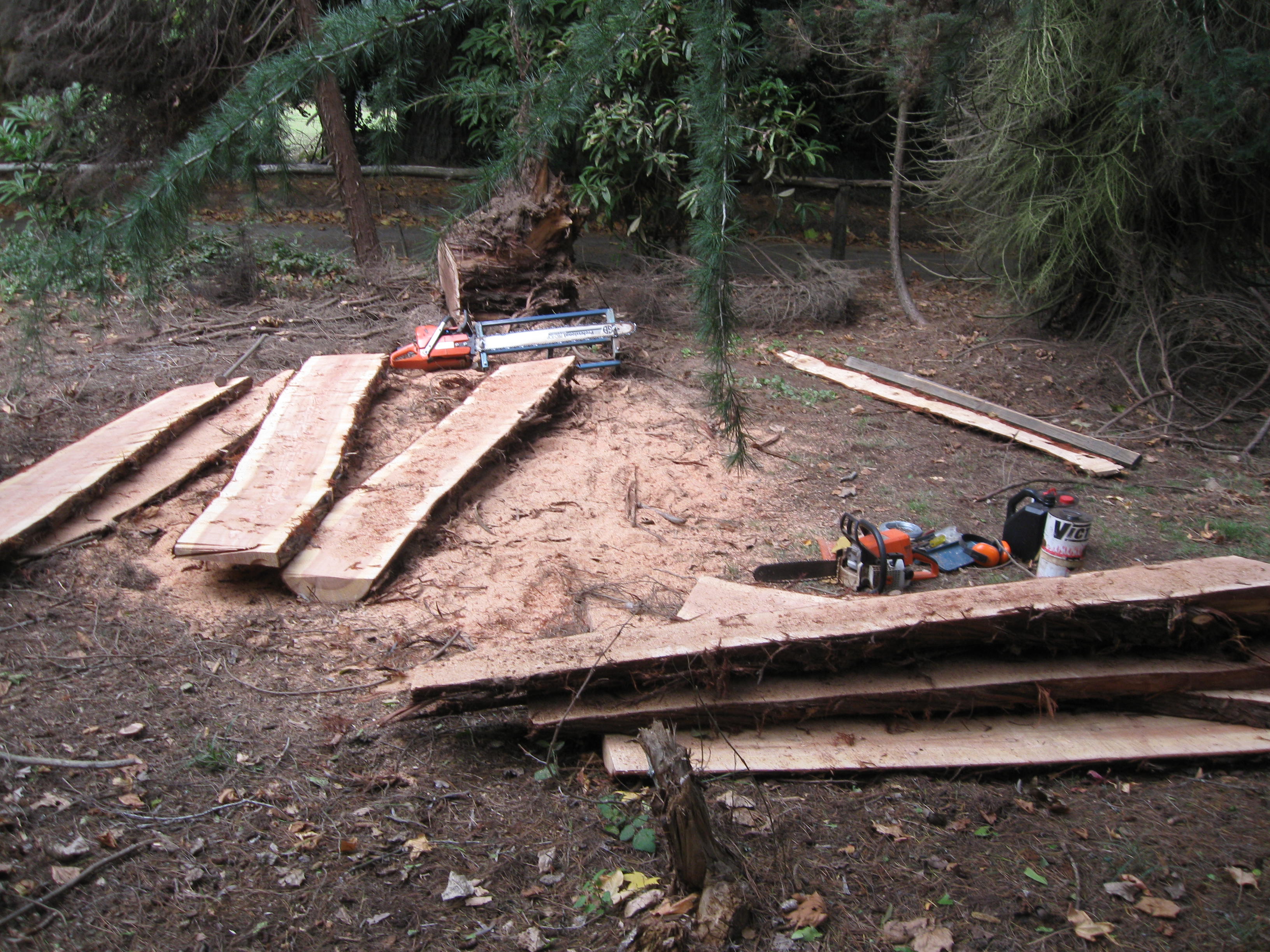 A few years ago when we were up visiting them, we went for a walkntalk out to the lookout, as we often did after a long lunch. We passed a fallen tree in the garden that had blown over in a storm and I asked Peter, “What are you going to do with that dead tree. It appears to be a Japanese cedar from the look of the bark. It’ll be a very nice nice piece of timber in there”. He replied that I could have it if I wanted it. I said that I did indeed want it and returned the next day with my truck and chain saws to mill it up into planks.