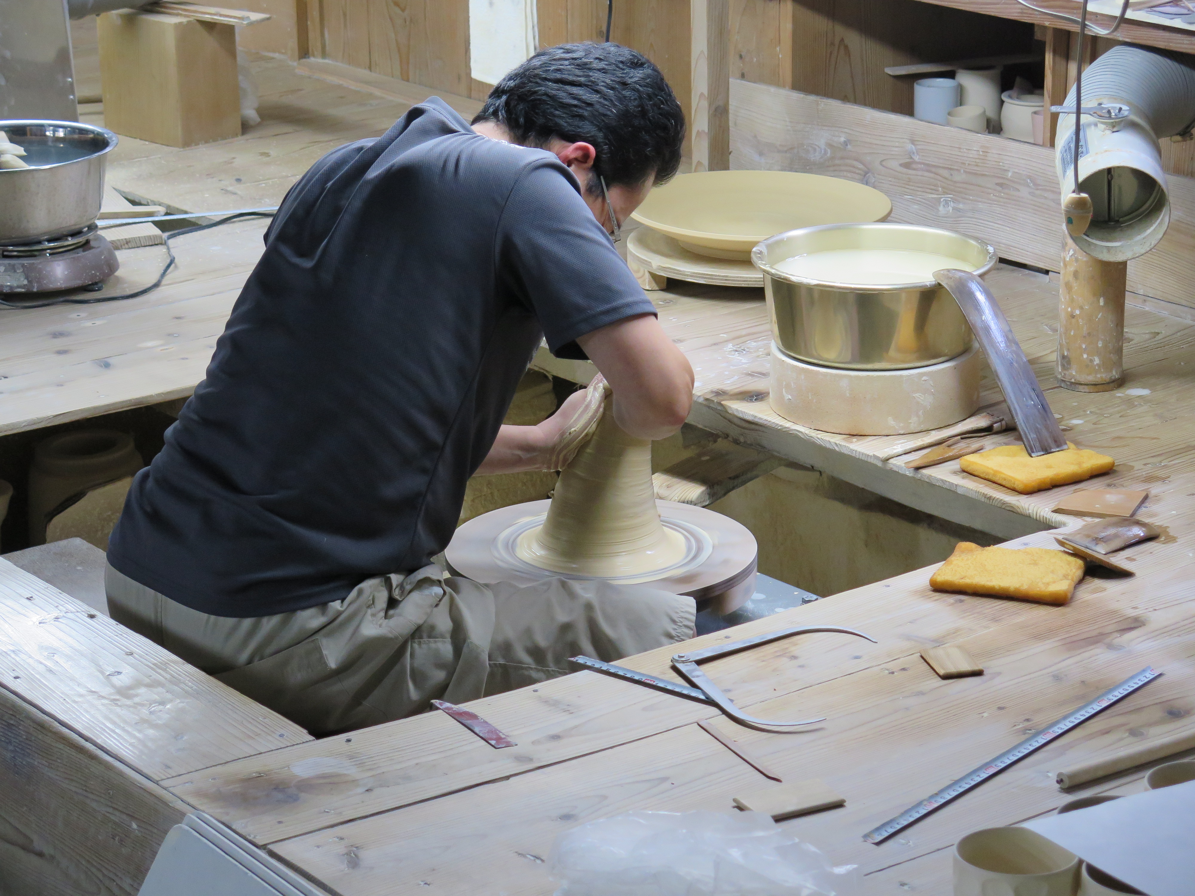 I’m at the wheel, turning my bowls in the workshop, when two Japanese lady visitors come in to see what is going on. They come over to watch and start to ask questions in local, rapid fire Japanese. I can’t make out a word of it. It’s all too fast for me. I respond that I’m a potter from Australia and just here for a short time to study Arita porcelain techniques. I apologise for the fact that I can’t speak Japanese. They can tell straight away from my appalling grammar and strange accent that I can’t speak Japanese, but I’m apparently doing it well enough for them to look quizzically at the workshop manager and ask. “If he says he can’t speak Japanese, how come he is telling us all this in Japanese”? He explains to me what they have just said and we all get a good laugh out of it.
