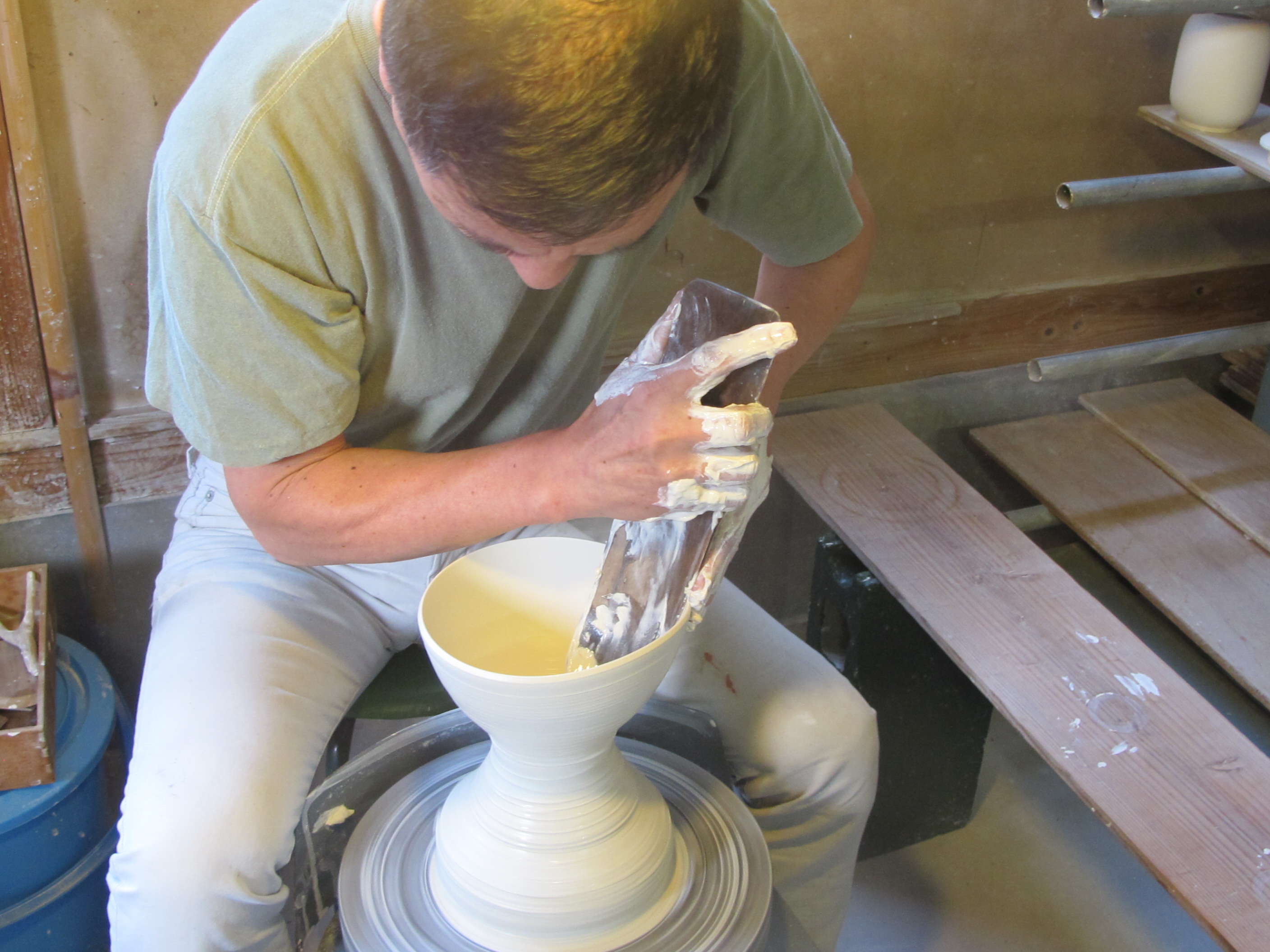 Following on from my visit to the maker of Kanna turning tools and other wooden pottery tools. This afternoon, I have just found the time to make my commitment to my new hand-made stretchy stick. An implement used here for throwing the inside of open forms. This particular one is specifically made for throwing and opening up bowl forms, stretching them out, as it were. So why would I want one? 🙂