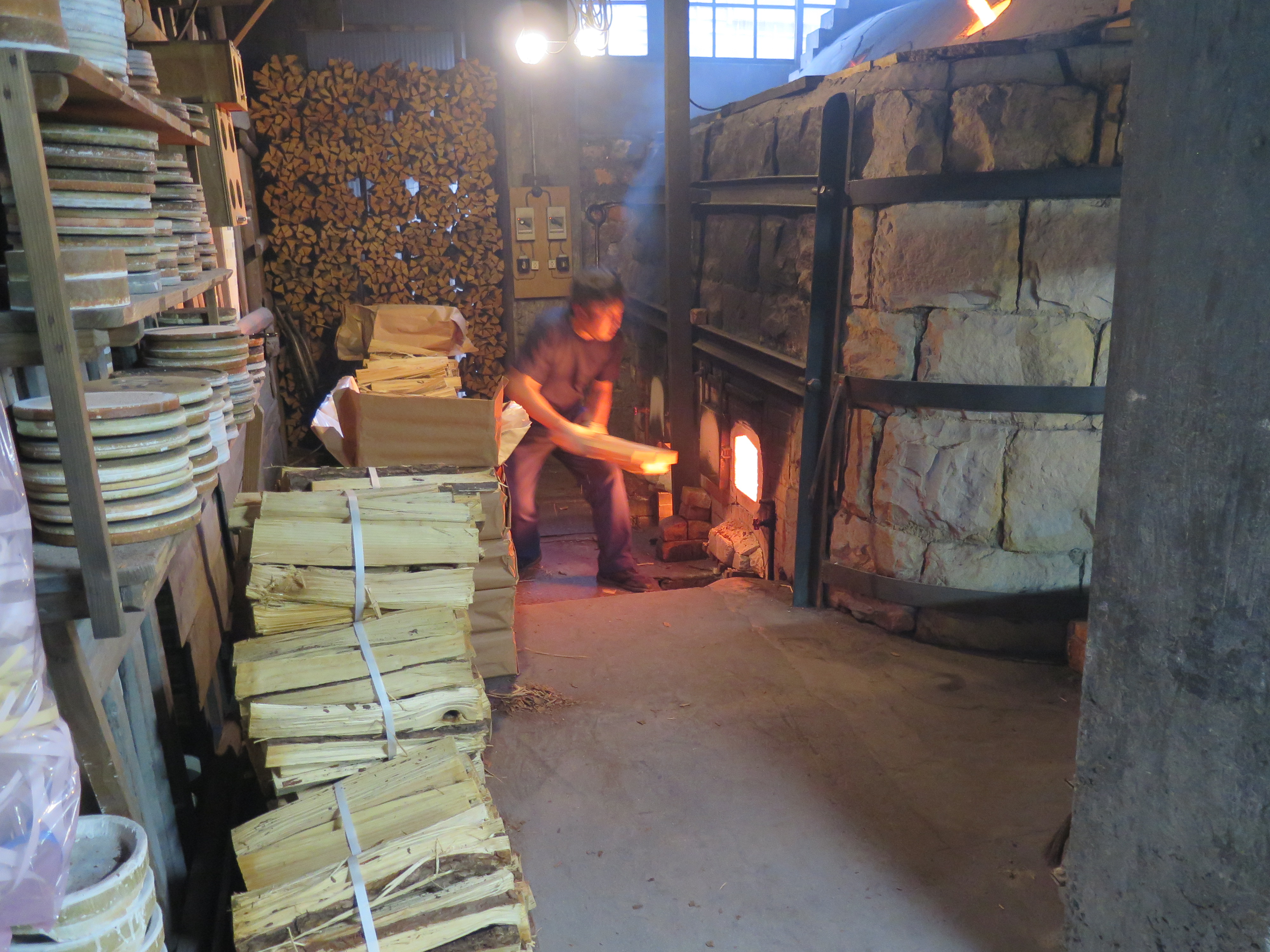 I’m also surprised that they are still firing a kiln like this with wood, as all the glazed pots are stacked in saggars inside the kiln, so there will be no aesthetic of wood fly-ash contact. The saggars add extra weight to the thermal mass and makes the firing less fuel-efficient. Seeing that there is no aesthetic benefit showing on the work. I wonder why they persist, especially as everyone tells me that they are doing it so tough here now and no one is making any money. They could reduce their firing costs significantly and clean the towns’ air quality by switching to a light-weight, low-thermal-mass, gas-fired, fibre or RI brick-kiln. If there really is some sort of aesthetic reason for persisting with the wood firing, then I can’t help but feel that the kiln should be moved out-of-town, changed to a downdraught firebox, or installed with a scrubber. I’m only an ignorant outsider here and have no right to be offering anyone any opinion, but these are the thoughts that go through my mind as I watch.
