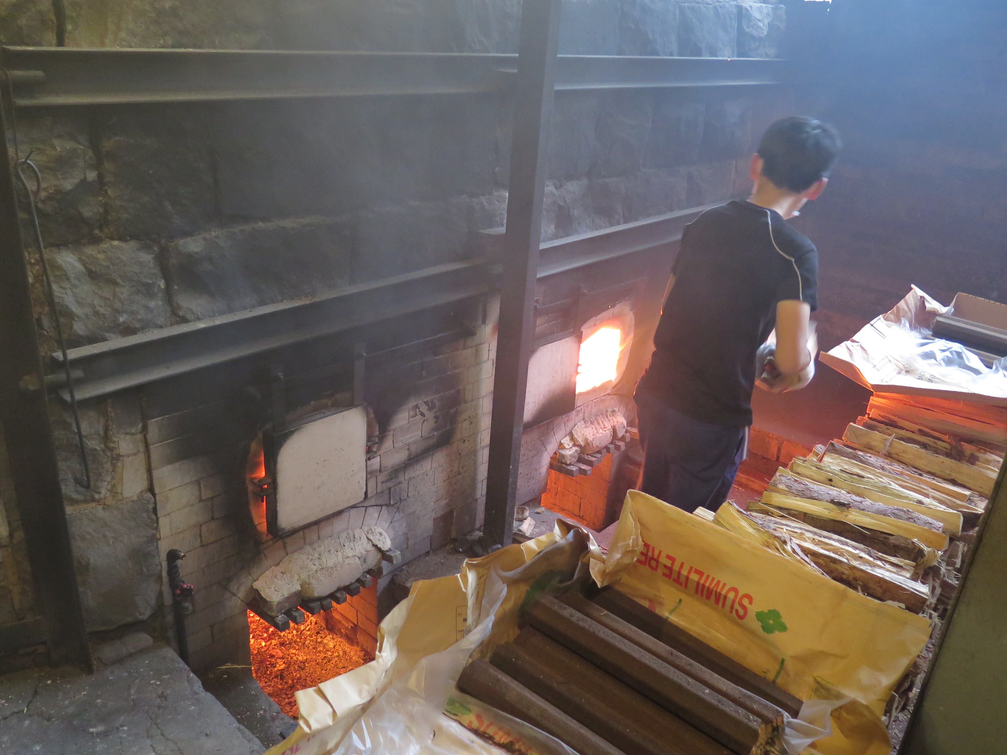 There are 2 fireboxes on each side of the kiln. Most likely firing up and over a bagwall, then down through the stacks of saggars to exit flues in the floor. These fireboxes are stoked alternately, first on the left, then the one on the right, symmetrical on each side, alternating every few minutes. There is a lot of smoky flame escaping through the vent holes and spy holes in the door, walls and dome. This is to inform the fireman as to the state of the atmosphere inside the kiln. He wants to know when the smoke is lessening and about to disappear. This indicates when it is time to re-stoke the fireboxes, so as to maintain the air-starved reduction atmosphere in the chamber. If I were here, doing this, I’d have all the windows open and a vent installed in the roof to clear the smoke from the work area. Actually, I’d probably get rid of the dirty up draught fireboxes with their expensive and short-lived metal fire bars and replace them with much cleaner downdraught fireboxes. For the comfort and health of the firemen, as well as improving air quality and fuel efficiency. I wonder if they realise that all that smoke billowing out of the kiln room and chimney top, represents expensive energy wasted?