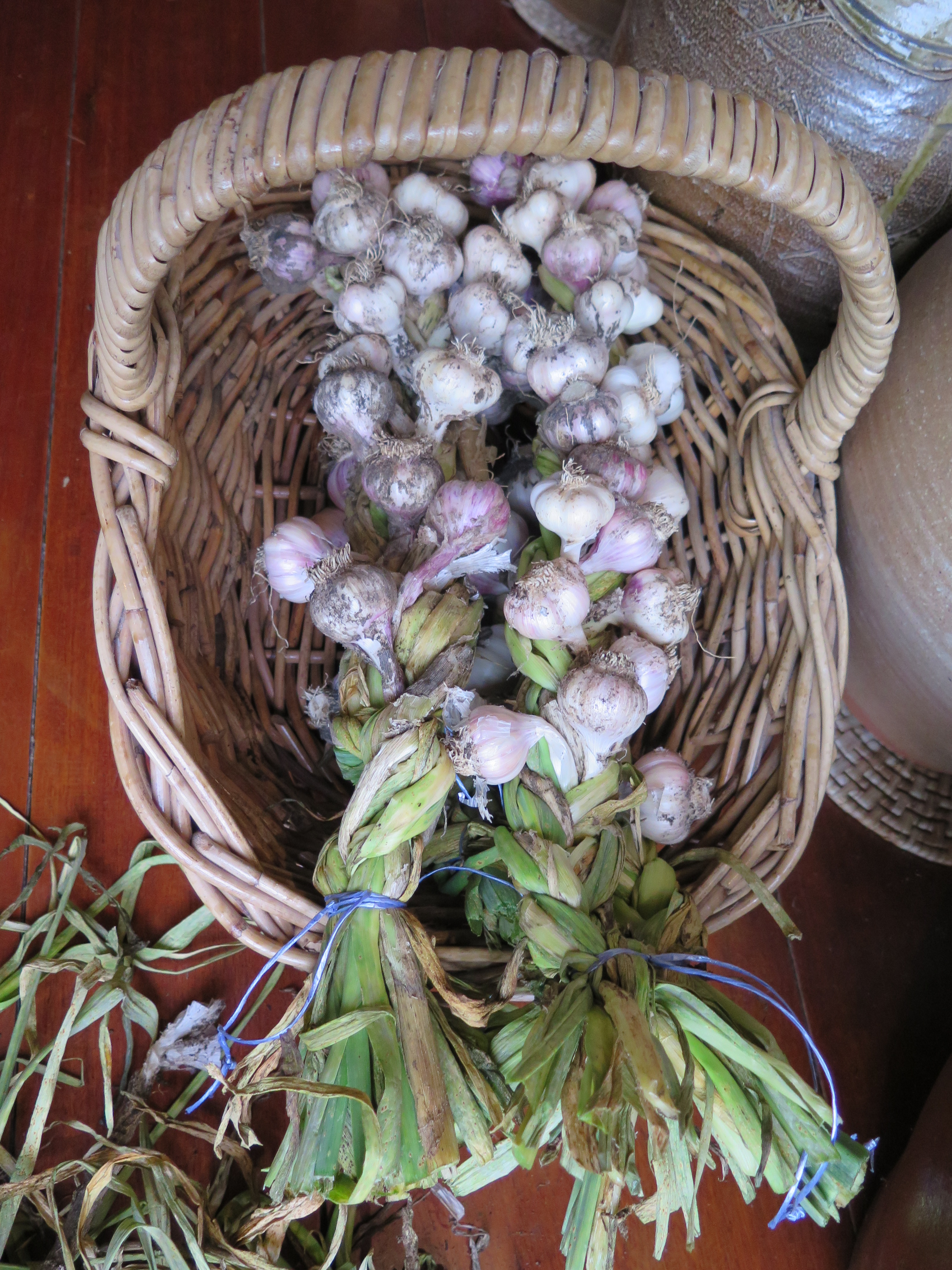 We save the largest and strongest bulbs for planting out for next seasons supply. These go back into the ground around about March, as soon as there is any sign of a green shoot. I usually see a few wild shoots appearing in the garden at this time. Some rogue cloves that have escaped captivity. They set the agenda, when they shoot up out of the ground, it’s time to replant the next years crop. We can still keep on eating the remainder of our stock from the kitchen plaits until it is all used up. We rarely last out the year, usually falling short by a month or two, but this year we made it right to the end by buying a plait from one of the members of our local ‘Seed Savers Group’.