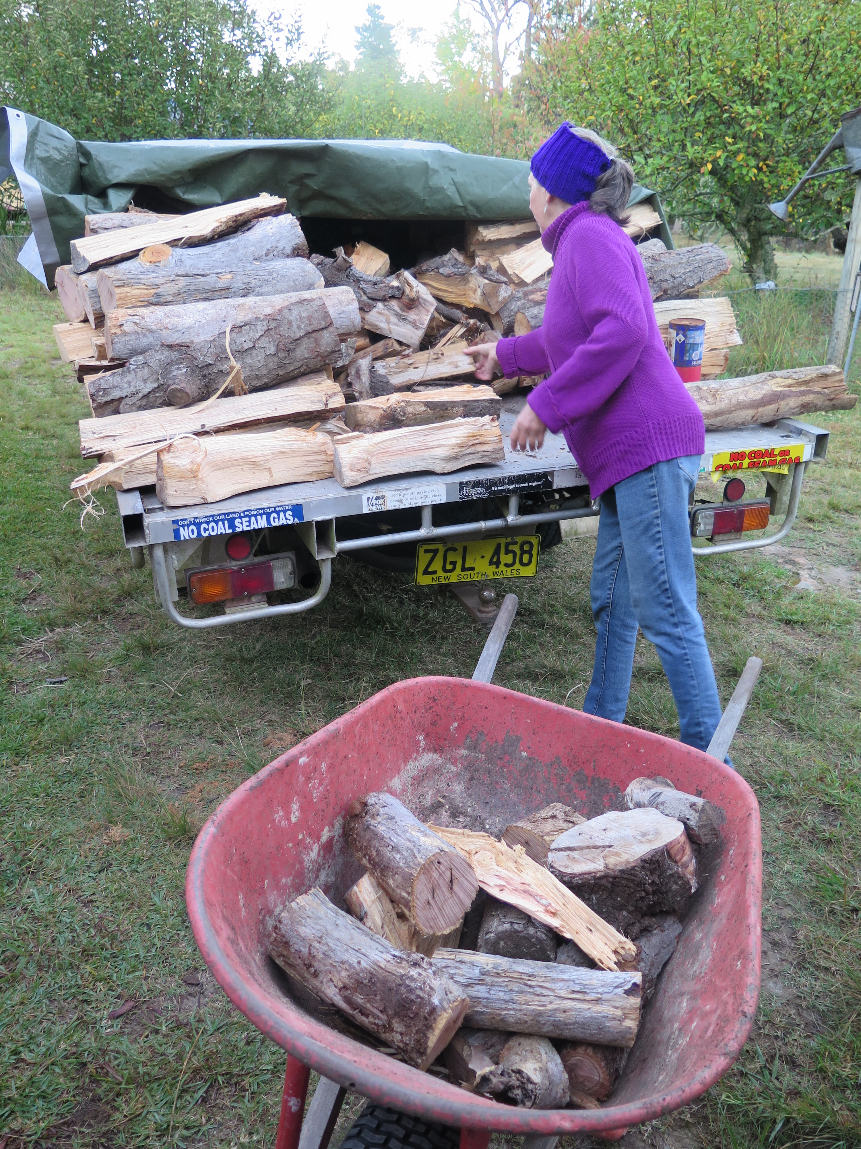 What I do know about this dead tree is that it is interesting. It is quite light in weight like a soft wood such as pine, but it has a strange twisted, interlocking grain like a hard wood such as a eucalypt. It turns out to be quite hard to split, even using the hydraulic splitter. It’s quite a tough wood. I’m hoping that it will burn well. But this is not knowable in advance until I actually get it into the fire box and see what happens over time. I have a lot of wood already cut, split and stacked ready for firing. I have several stacks, each about enough for a firing. I have stringybark, paperbark, ironbark and she oak all ready and prepared as well as a firings worth of radiata pine, from a load of trees brought here by a local contractor who was asked to clear a building block to make a house site. I naively said “yes. Bring the trees here, sure, I’ll take them”!