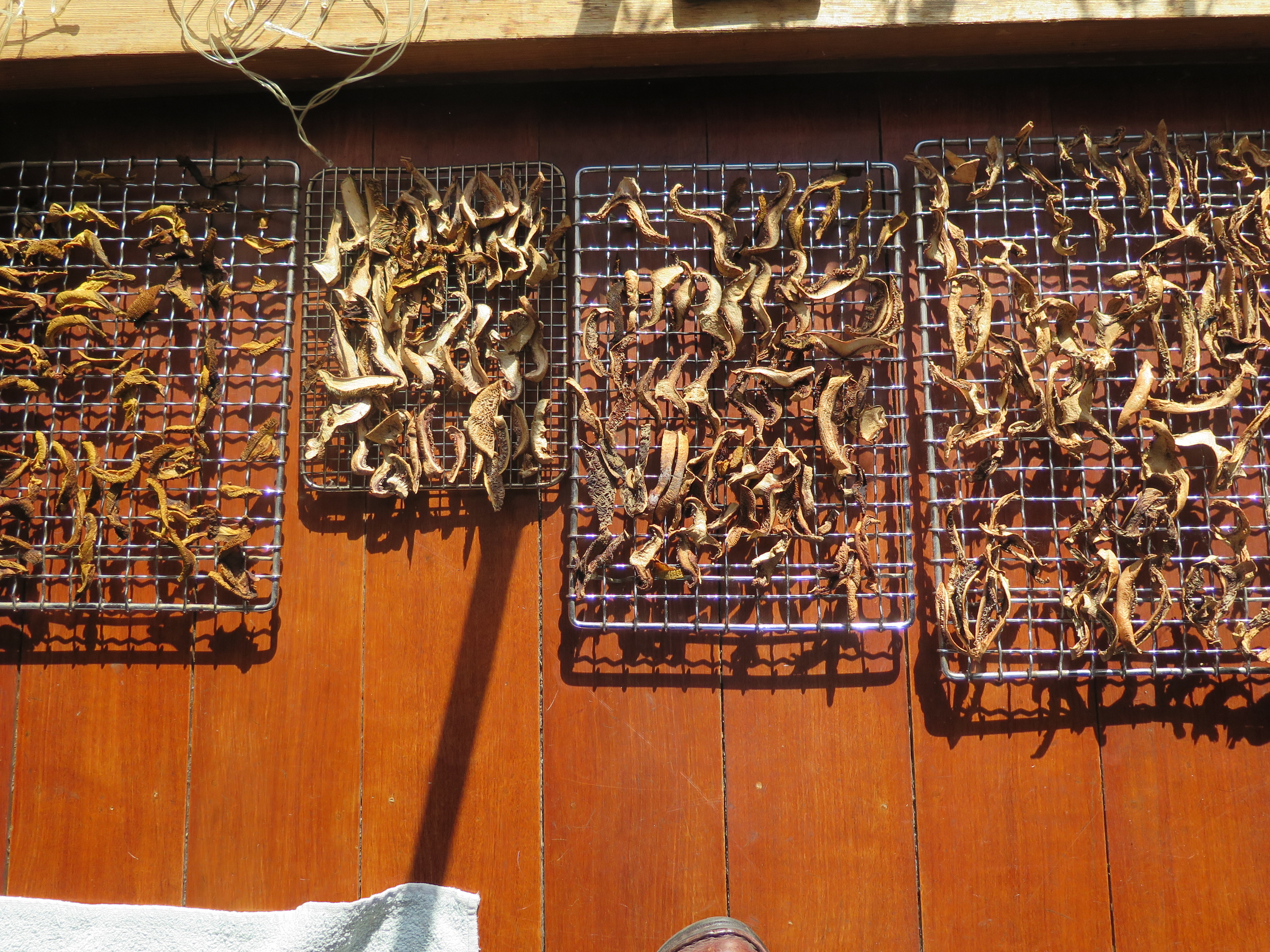 I collect more mushrooms from the recent fungal blooms. I give them a good scrub with the bristle brush and clean them up and make them presentable. There is always bits of grass and other organic ‘natural’, but unwanted ‘stuff’ stuck to them. I slice them and lay them out to dry.