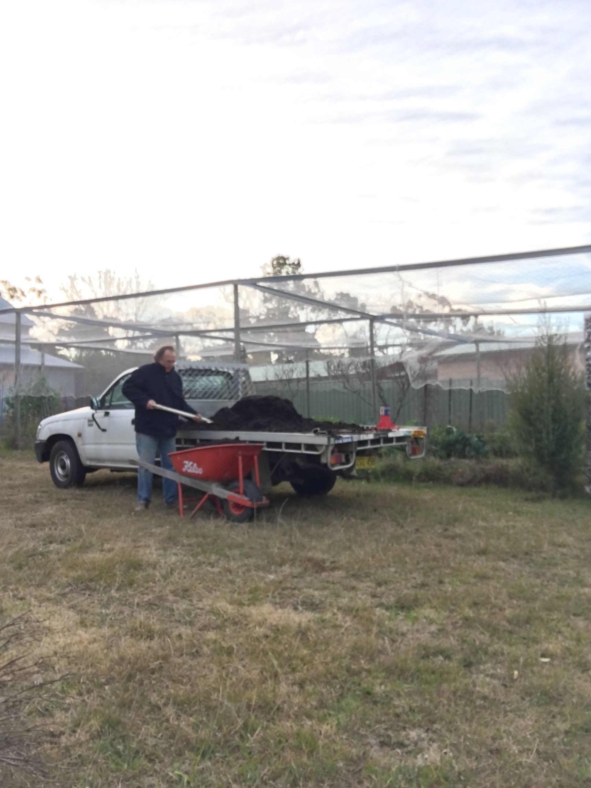 We have been very busy all week. The mornings are cold and a bit misty. We have been having frosts on most mornings. I have to go into town to get some parts for a kiln job, so I take the truck and make the trip pay, by returning with a ute-load of mushroom compost as a bonus. I get stuck into it in the afternoon and unload it into the wheel barrow to spread it around the vegetables. I pull out a lot of spent plants that have been killed off by the frost. Plants like basil are all dried out and dead sticks now. I pull the plants out and weed the patch, then cover it with compost to stop weeds taking advantage of the increased sunlight.