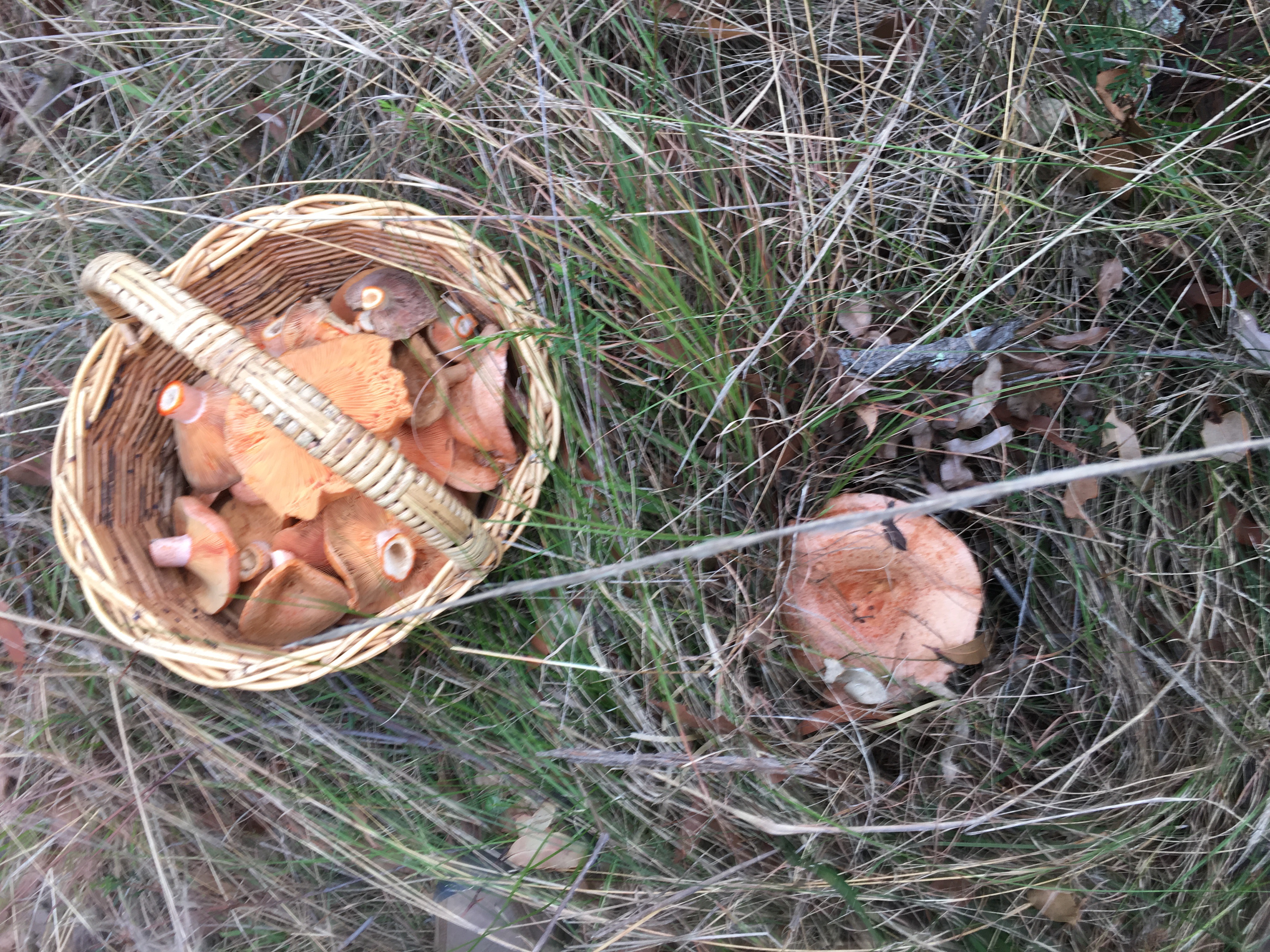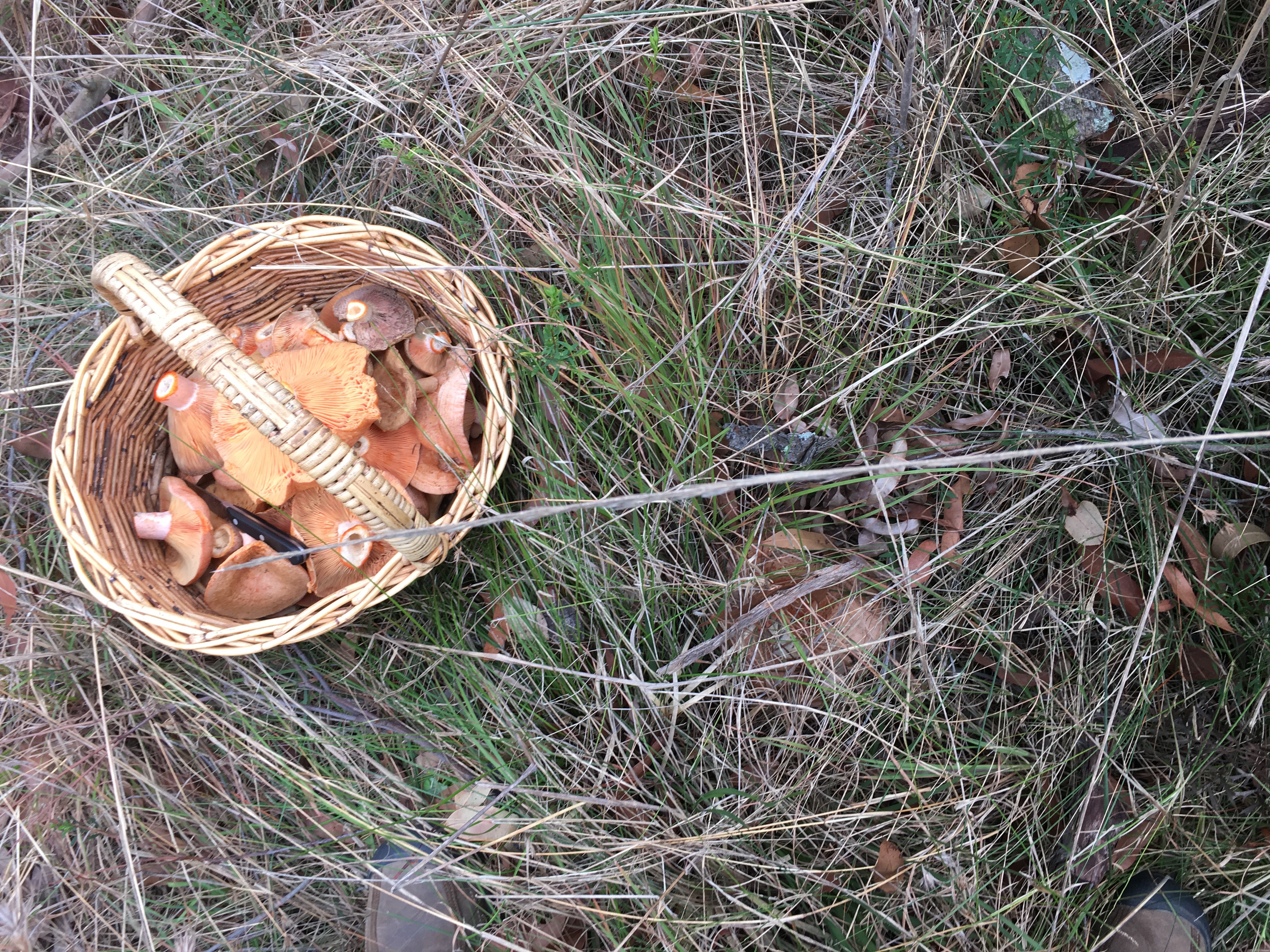 I double back along the other side of the train line and find some more rich pickings. Mostly slippery Jacks on this side. A third of my haul are slippery Jacks, which are sometime called ‘sticky buns’ I guess because of their domed shape and brown sticky/slimey feel, depending on wether they are wet or dry when you find them. The other 2/3 of my basket are the red pine mushrooms that we have learnt to call ‘saffron milk caps’.